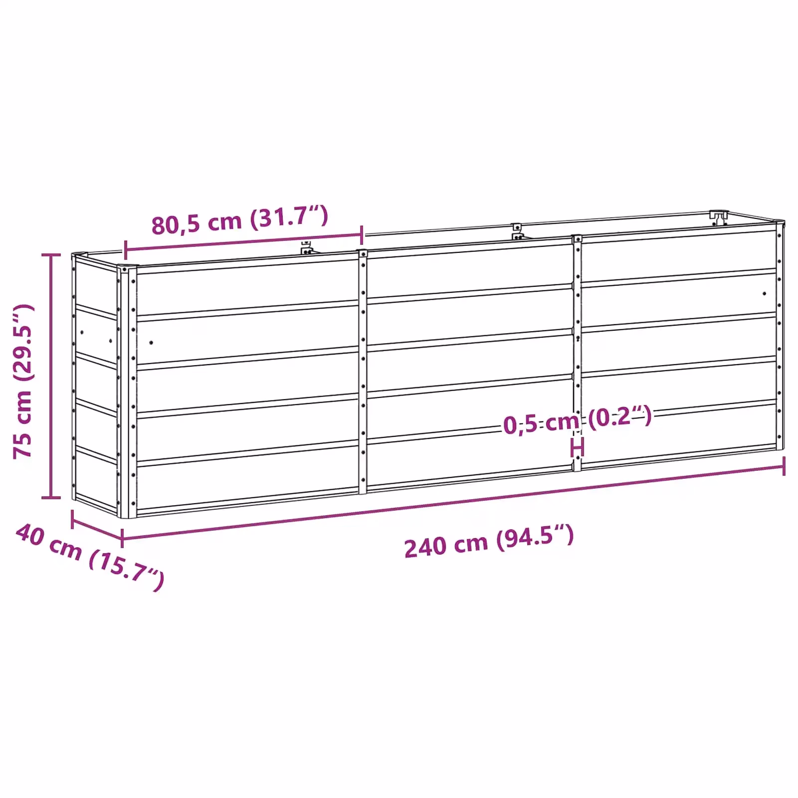 • Ruumikad mõõdud 160 x 40 x 75 cm loovad pika istutusala, mis sobib nii madalate ääristega lillede kui ka kõrgemate taimede ritta paigutamiseks.