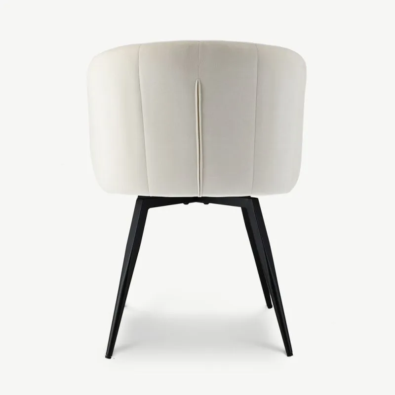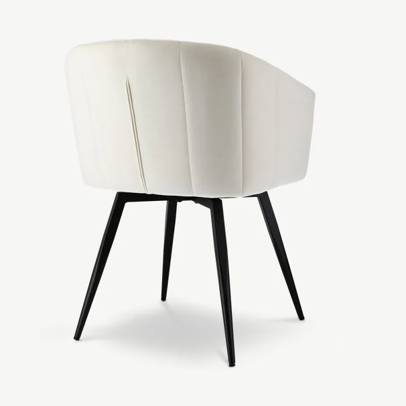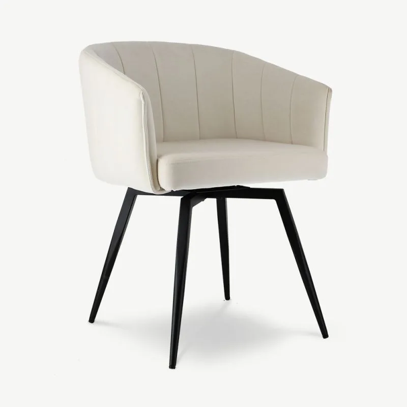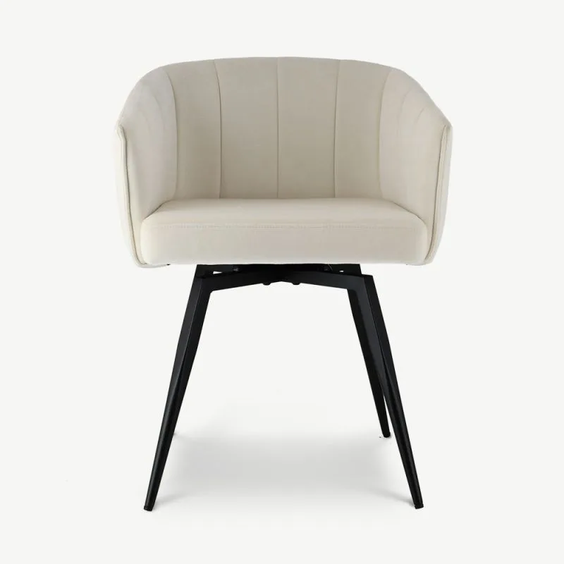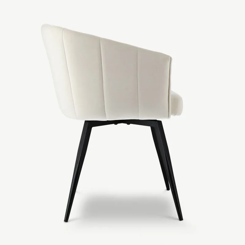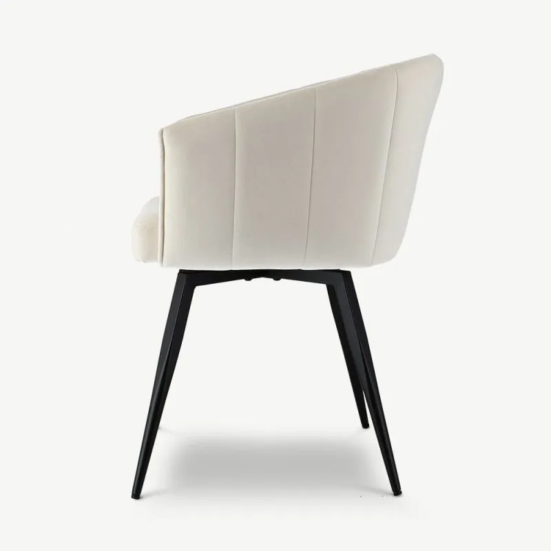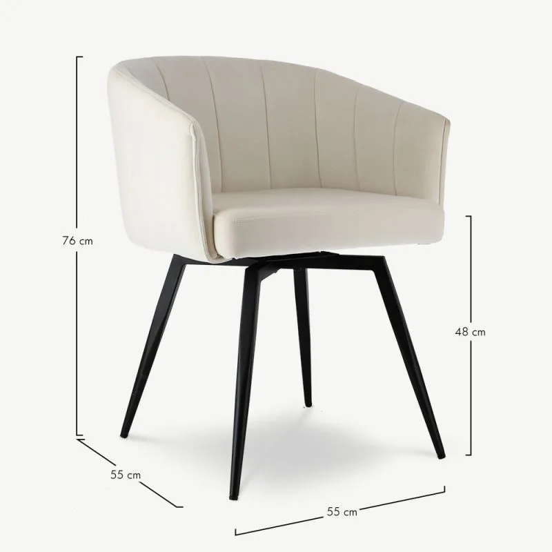 Ben valge pöörleva söögitugitooli pakub täiuslikku mugavuse ja moodsa disaini kombinatsiooni. Sametpolsterdus ja musta värvi metallist jalad tagavad pehme, luksusliku istumiskogemuse, samal ajal kui pöörlemisfunktsioon hõlbustab liikumist, muutes selle suurepäraseks valikuks pikkadeks õhtusöökideks kodus või restoranis või tööseanssideks igas kaasaegses ruumis.