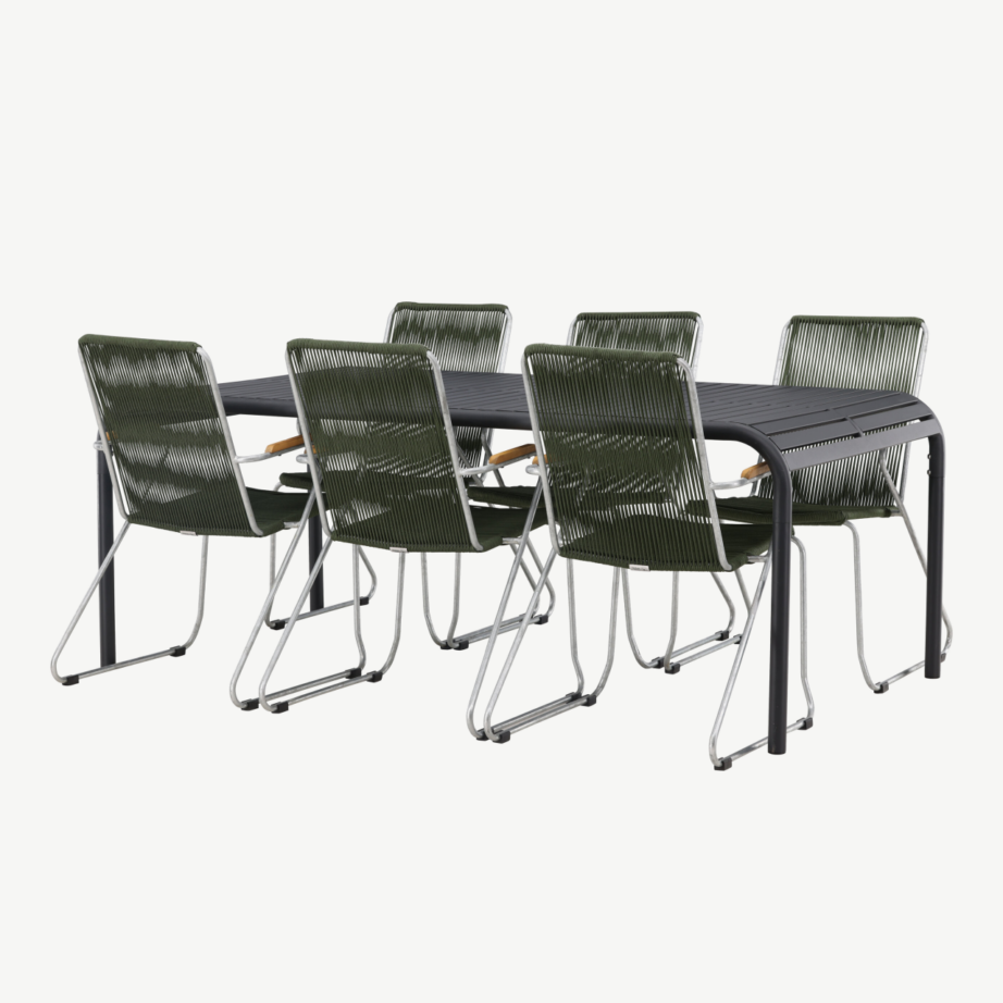 Borneo söögikomplekt toob igasse väliruumi põhjamaist stiili ja mugavust, olles ideaalne valik neile, kes hindavad nii funktsionaalsust kui ka modernset disaini. Komplekti kuulub tugev alumiiniumist ristkülikukujuline laud ning 6 mugavat rohelistest polüpropüleenist köiest istega tooli – täiuslik kooslus terrassi, rõdu või aeda.