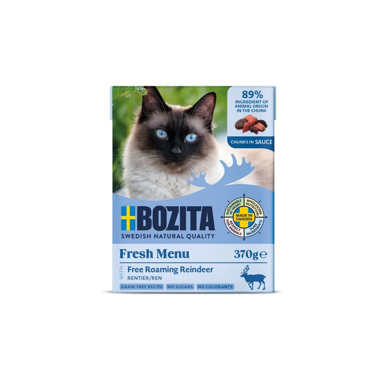 Bozita põhjapõdraliha kassitoit märgtoit on teraviljavaba ja sobib igas vanuses kassidele, pakkudes tasakaalustatud toitu ilma kunstlike värv- ja säilitusaineteta. Pakendis on 370 g maitsvat põhjapõdraliha kastmes.