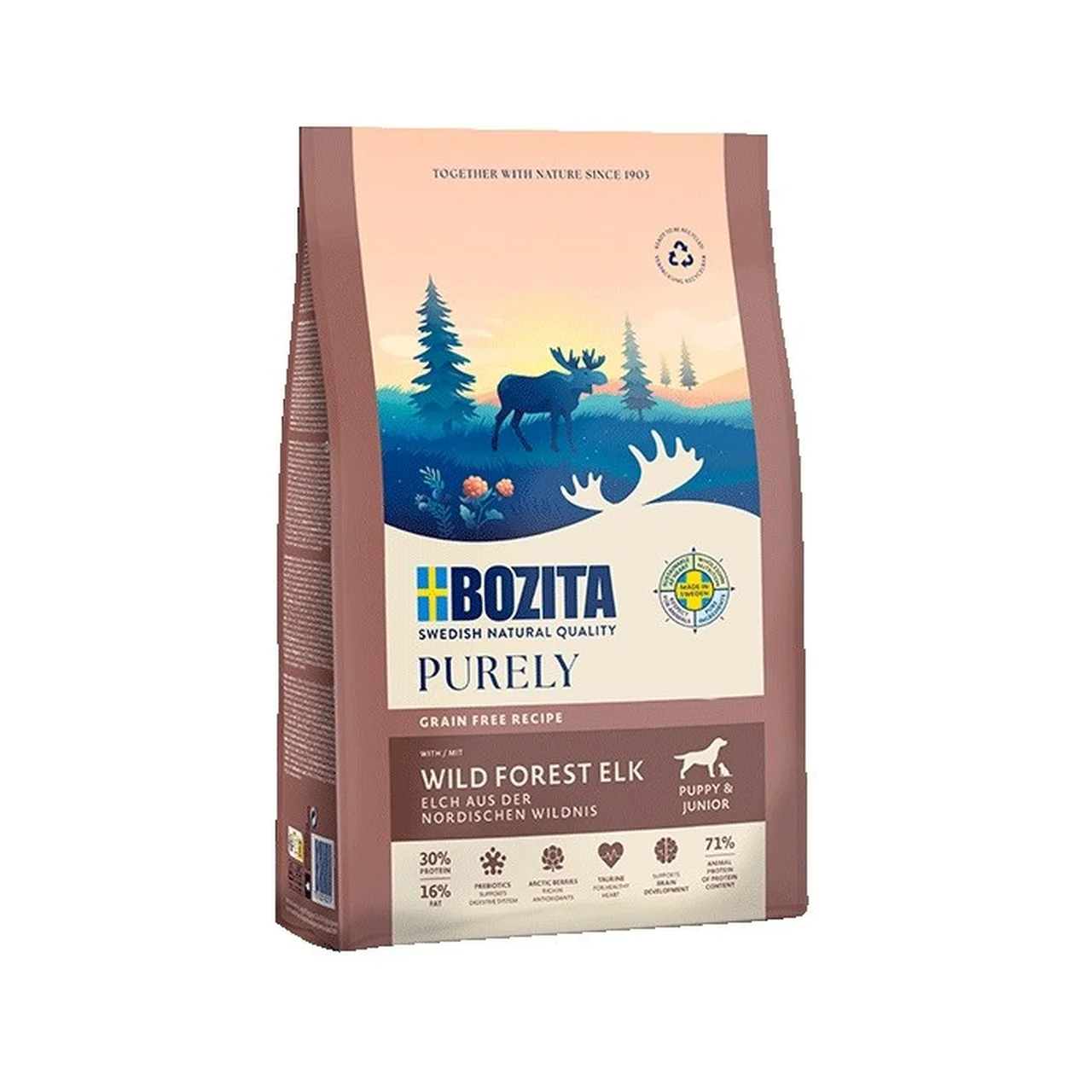 Bozita Purely Junior Elk with chicken on kvaliteetne täisväärtuslik kuivtoit, mis on loodud spetsiaalselt kasvuperioodil kutsikatele, noortele koertele ning sobib ka tiinetele ja imetavatele emastele. Toode on teravilja- ja gluteenivaba ning ei sisalda kunstlikke värv- ega maitseaineid, võimaldades pakkuda koerale looduslikku ja tervislikku toitu. Põhikoostisosadeks on põdra- ja kanaliha ning muna, mis varustavad areneva koera organismi kergesti omastatavate valkude, rasvade ja vajalike toitainetega.