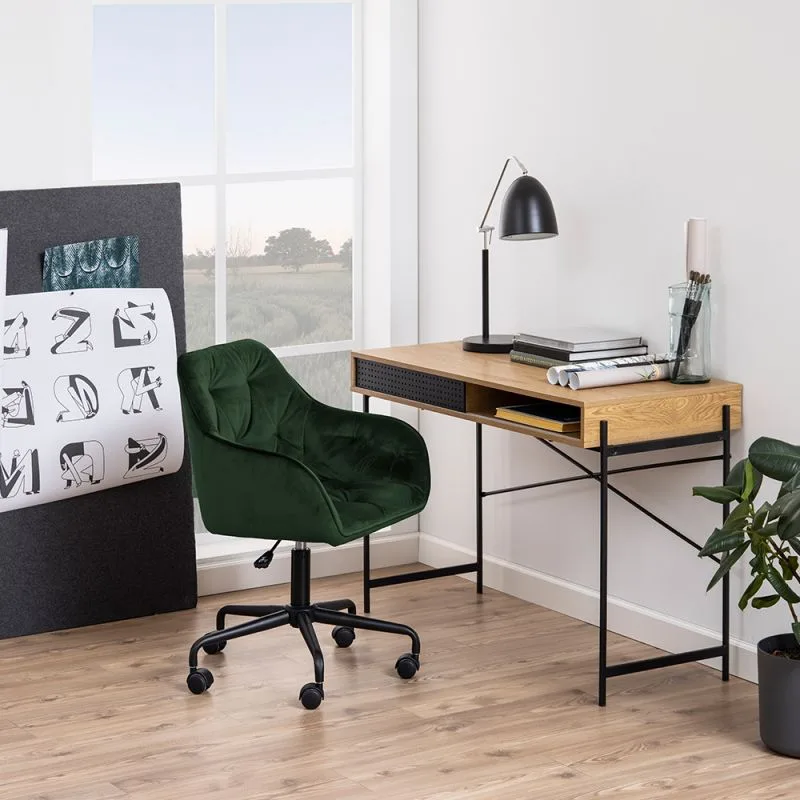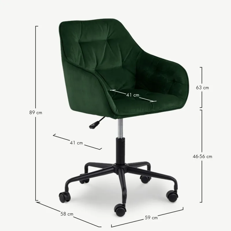 Lisa oma tööruumi mugavust ja stiili Brooke rohelisest sametist kontoritooliga. See elegantselt disainitud tool pakub tänu kõrguse reguleerimisele ja praktilistele detailidele ideaalset tasakaalu funktsionaalsuse ja esteetika vahel. Sobides nii kodukontorisse kui ka noore toa sisustusse, muudab see tool igapäevase töö või õppimise märkimisväärselt mugavamaks.