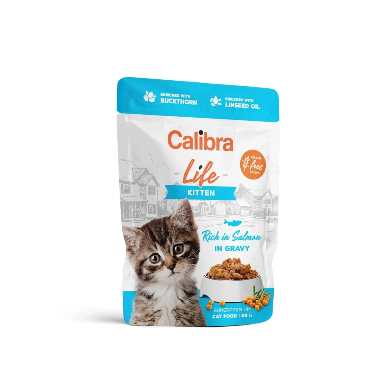 Calibra Cat Life pouch Kitten Salmon in gravy on spetsiaalselt kasvuperioodil olevatele kassipoegadele loodud tasakaalustatud märgtoit, mis sisaldab lõhet maitsvas kastmes. See täissööt katab kõik kasvava kassipoja toitainevajadused, toetades nende arengut ning üldist tervist. Toode on gluteeni- ja teraviljavaba, sobib kõigi tõugude kassipoegadele ning on välja töötatud koostöös loomaarstidega.