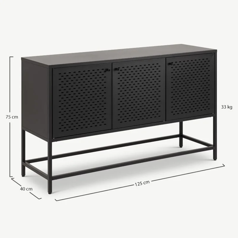 Kolme uksega kummut pakub rohkelt ruumi vajalike esemete korrastamiseks. Kaks sisemist riiulit võimaldavad mugavat paigutust, hoides kõik vajalikud esemed käepäraselt organiseerituna. Metallsõrestikuga uksed annavad kapile erilise visuaalse efekti, lubades vähesel määral sisu näha, kuid säilitades samas korrapärase ja minimalistliku välimuse.