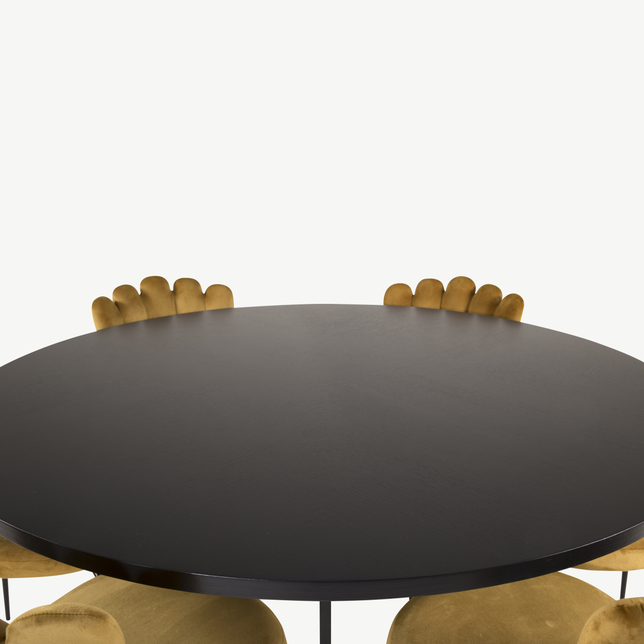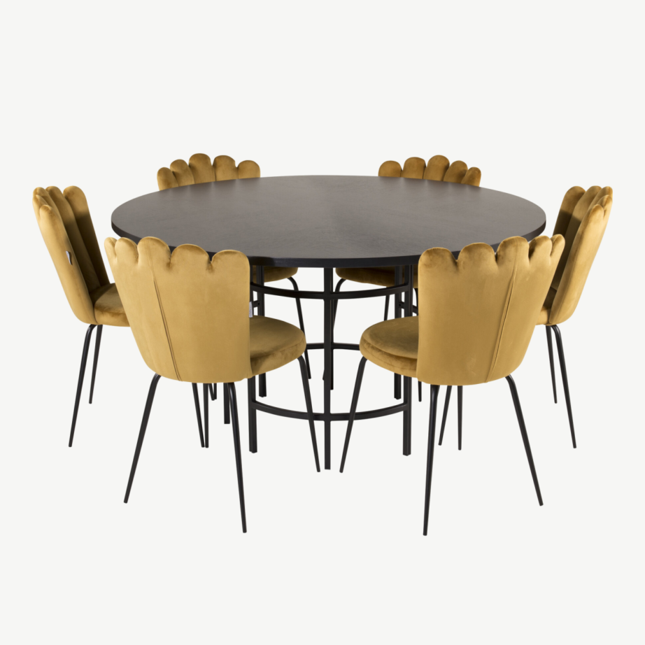 Kaunista oma söögituba kaasaegse Copenhageni ümmarguse söögirühmaga, mis ühendab põhjamaise elegantsi ning igapäevase praktilisuse. Kompletis on modernne, musta viimistlusega ümmargune laud ning kuus pilkupüüdvat Limhamni söögitooli luksusliku kuldse sametkattega. See ümmargune söögilaud samettoolidega loob avara ja hubase atmosfääri ning sobib suurepäraselt nii perega õhtustamiseks kui ka sõprade võõrustamiseks.