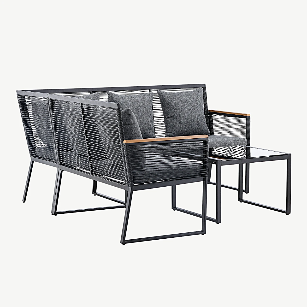 - Kvaliteetsed ja vastupidavad materjalid: Diivanit ja lauda raamib tugev must teras, mis tagab stabiilsuse ja kestvuse ka aktiivse välikasutuse korral. Selja- ja käetugesid katab ilmastikukindel polürotang, pakkudes modernset joont ning sobitudes suurepäraselt põhjamaise kliimaga.