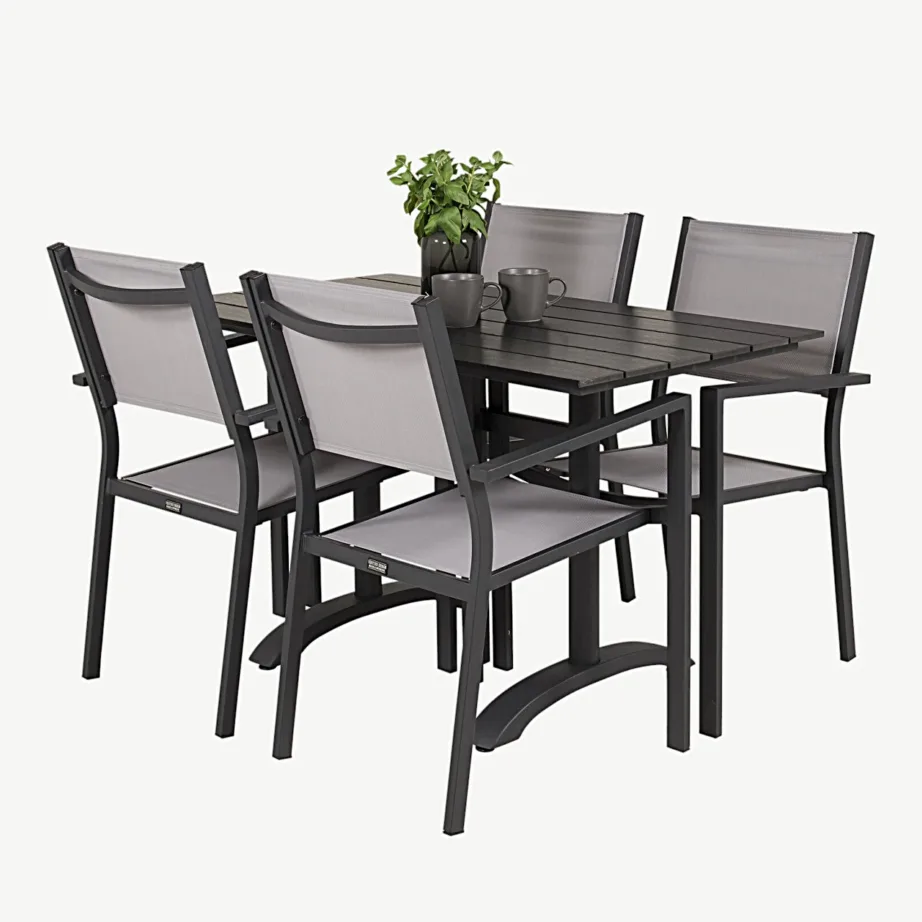 Denveri ristkülikukujuline must aiamööblikomplekt on maitsekalt modernse disainiga komplekt, mis sobib suurepäraselt nii rõdule, terrassile kui ka aeda. Komplekt koosneb kvaliteetsest ristkülikukujulisest söögilauast ning neljast Copacabana sarja käetugedega toolist, pakkudes hubast ja stiilset õhkkonda igale põhjamaisele õuealale.