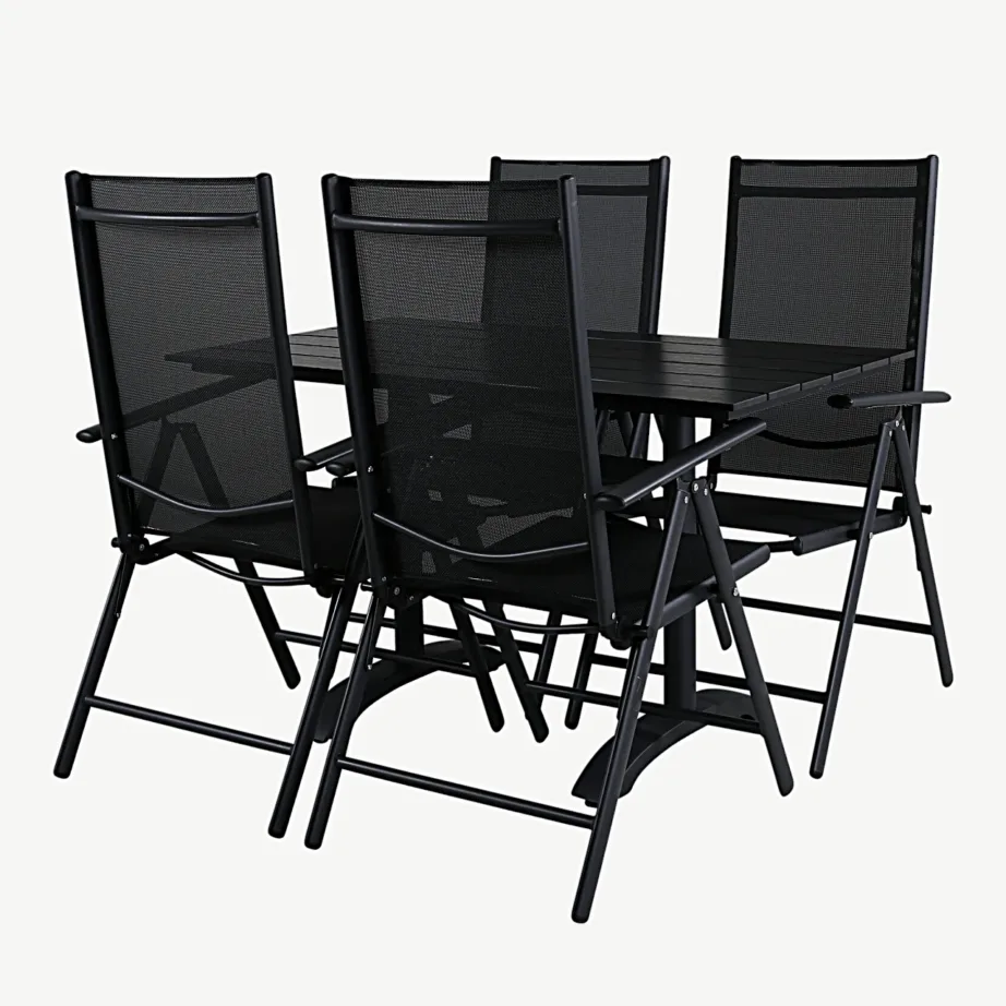 Too oma aeda või terrassile skandinaavialik funktsionaalsus ja ajatu disain! Denveri sari ühendab klassikalise vormi ning tänapäevased, vastupidavad materjalid – ideaalne valik, kui otsid musta aiamööbli komplekti, mis peab ajale vastu ning tagab mugava istumise ka pikemaks ajaks. Komplekti kuulub ristkülikukujuline lauaga söögilaud ja kuus musta raamiga kokkupandavat tooli, mis sobivad suurepäraselt nii pere kui sõpradega väljas istumiseks.