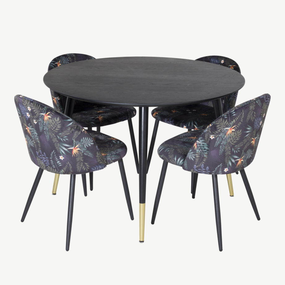 Minimalistliku joonega must söögilaud loob elegantse tausta nii igapäevaseks kui ka pidulikuks kasutamiseks. Troopilise mustriga sametist toolid lisavad ruumile isikupära ja tagavad mugava istumise ka pika einestamise puhul. Ümmargune laud soodustab vestlusi ja võimaldab kõigil võrdselt osa saada söögikorrast.