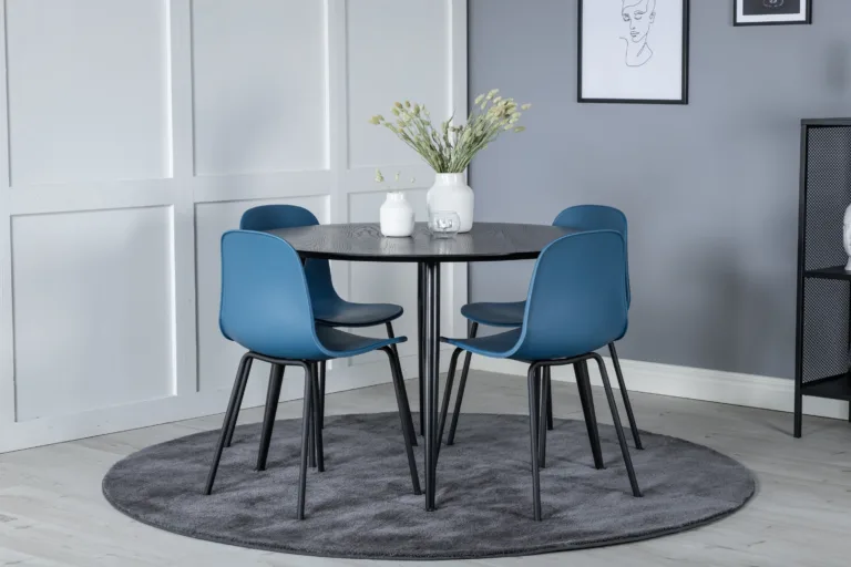 - Värvid: laud – must; toolid – sinised mustade jalgadega.