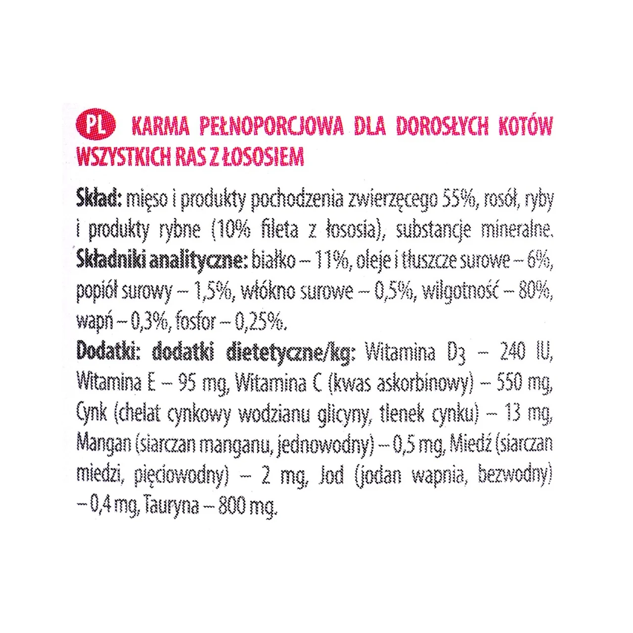 Dolina Noteci Piper Animals with Salmon on teraviljavaba märgtoit, mis on mõeldud kõigile tõugudele täiskasvanud kassidele igapäevaseks täisväärtuslikuks söögiks. Tänu kvaliteetsele lõhele ja loomsetele valkudele pakub see toit vajalikku energiat ning aitab hoida sinu kassi karva läikivana, seedimist korras ja immuunsüsteemi tugevana. Toode ei sisalda kunstlikke lõhna-, maitse- ega värvaineid ning teravilju, sobides eriti tundliku seedimise või toiduallergiaga kassidele.