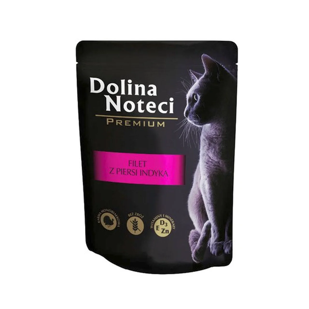 DOLINA NOTECI Premium kalkunifilee märgtoit on teraviljavaba täistoit täiskasvanud kassidele, sisaldades 85 g kvaliteetset kalkuniliha, suhkru- ja sojavaba.