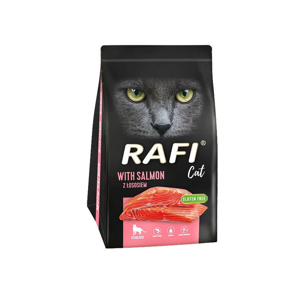 RAFI Cat Sterilised with salmon on spetsiaalselt steriliseeritud ja kastreeritud kassidele mõeldud täissööt, mille põhikomponendiks on lõhe. Toit aitab säilitada kassi tervislikku kehakaalu ning toetab tema aktiivsust ja üldist heaolu igapäevaselt. Pakend sisaldab 1,5 kg kuivtoitu, mis sobib täiskasvanud kassidele, kellel on kalduvus ülekaalulisusele või vajadus hoida kehakaalu kontrolli all pärast steriliseerimist.