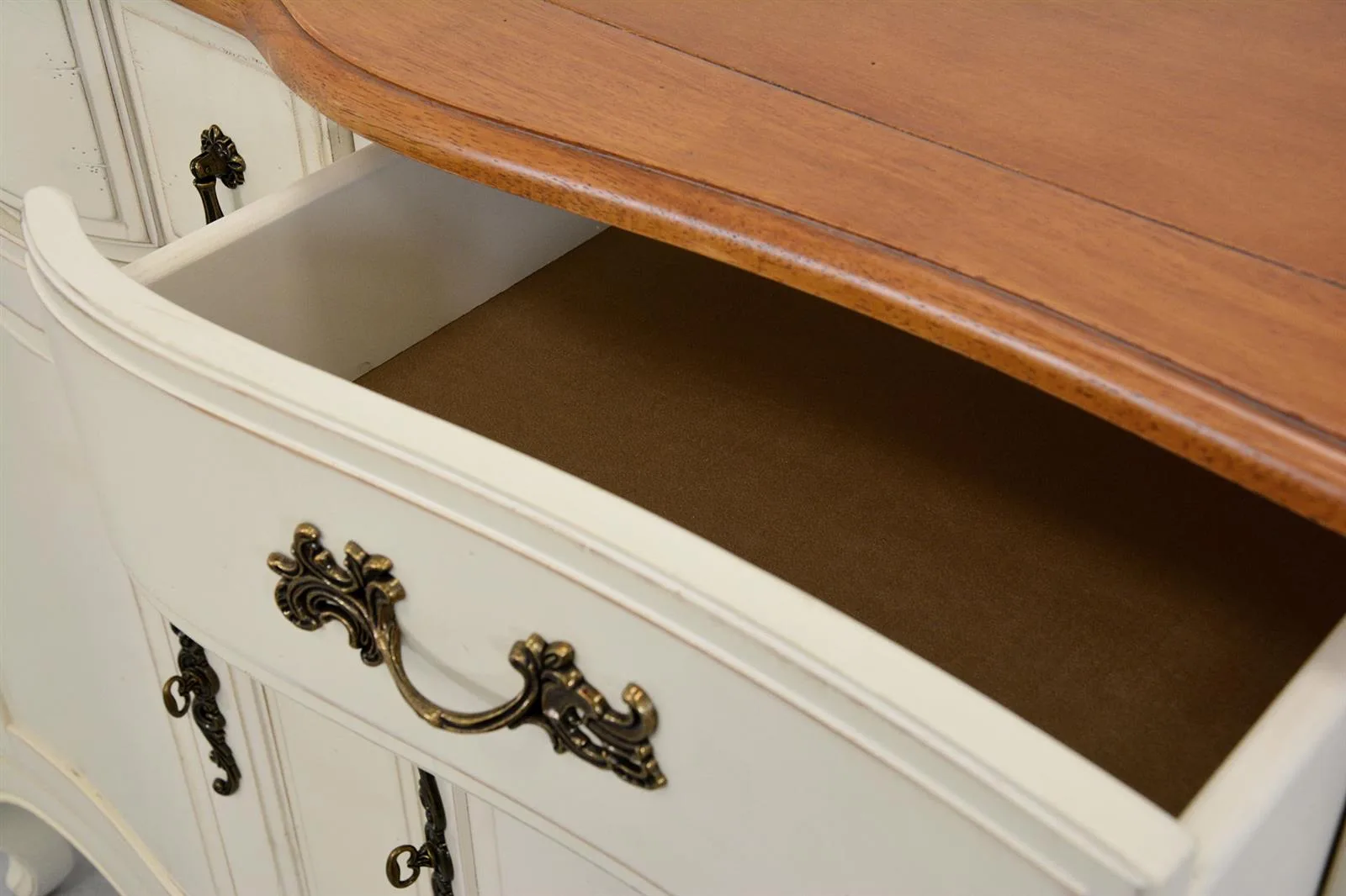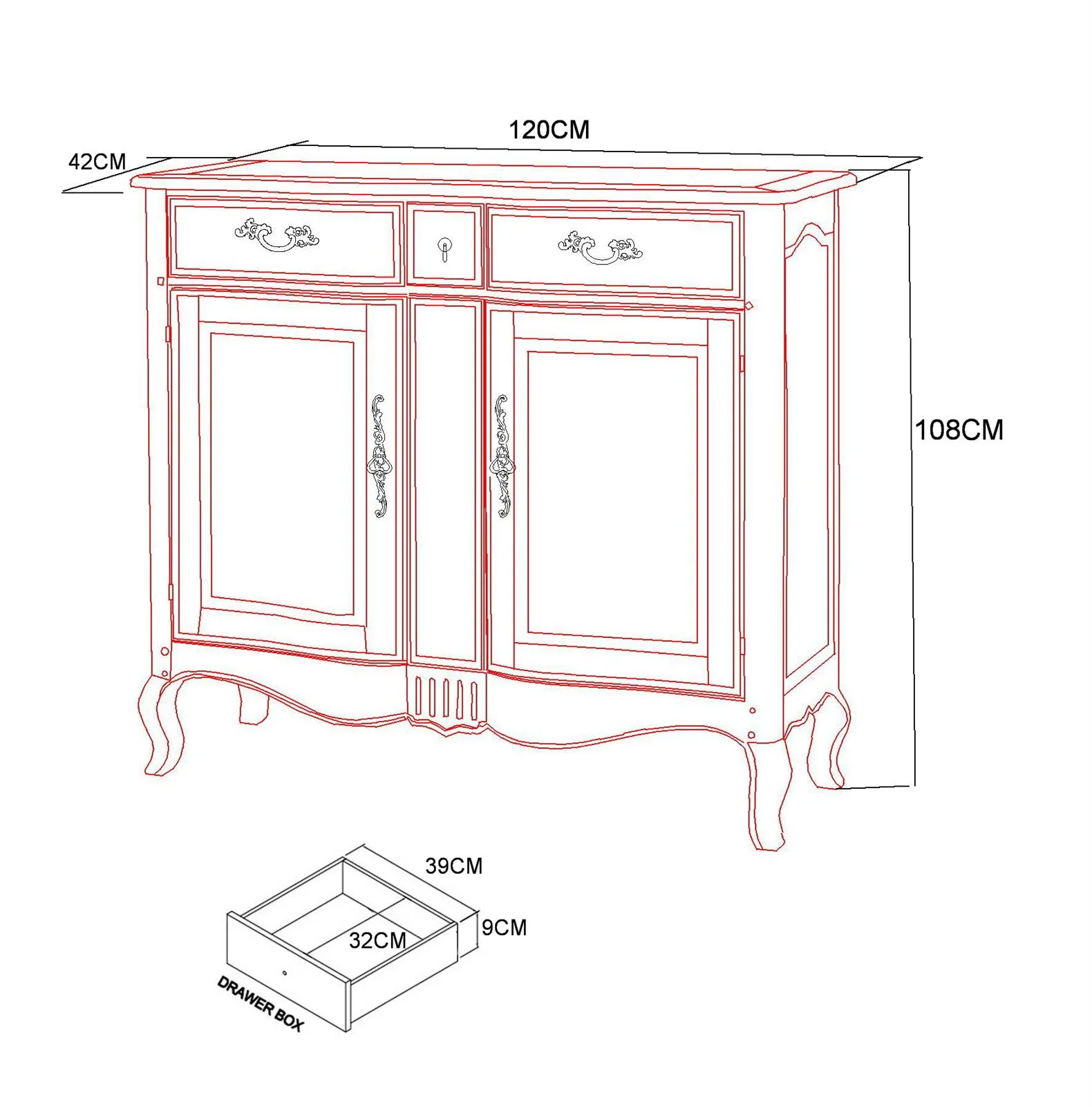 Täiendavad detailid: Kaks ust, kaks riiulit, metallist käepidemed, sametmaterjal sahtlites.