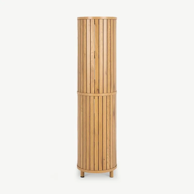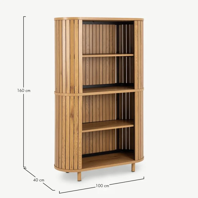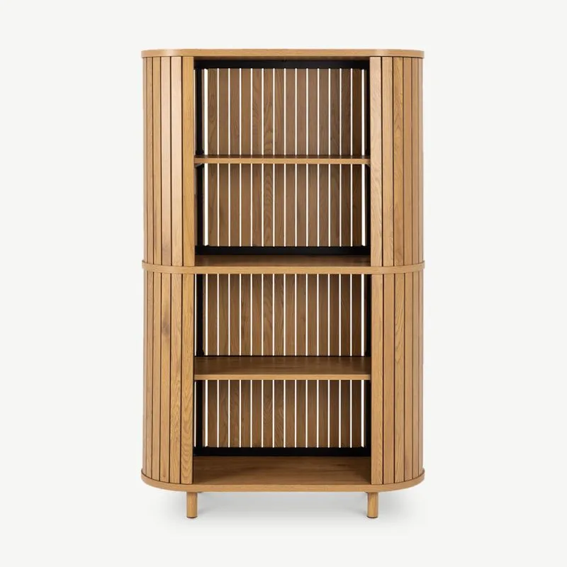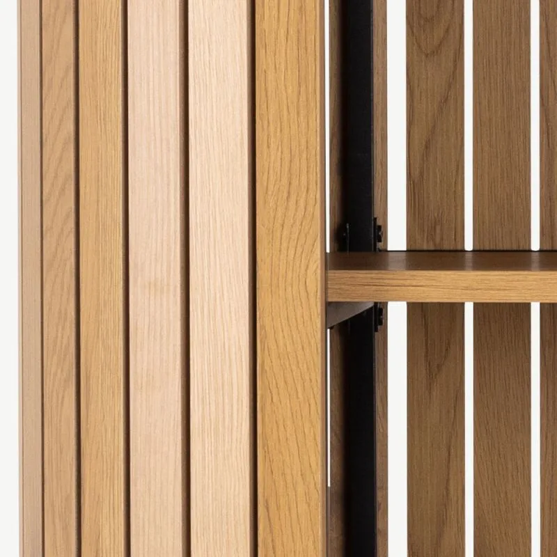 Raamaturiiulit kaunistavad vertikaalsed lamellid, mis lisavad ainulaadset arhitektuurset iseloomu. Need mitte ainult ei too ruumi visuaalset sügavust, vaid loovad ka stiilse ja modernse ilme. Tugevad metallist jalad koos tammeviimistlusega tagavad stabiilsuse ja pikaealisuse.