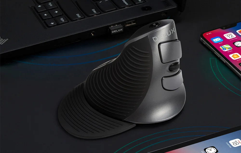 Ergonoomiline juhtmevaba vertikaalne hiir Delux M618G DB (Bluetooth, 2.4G, randmetoega)