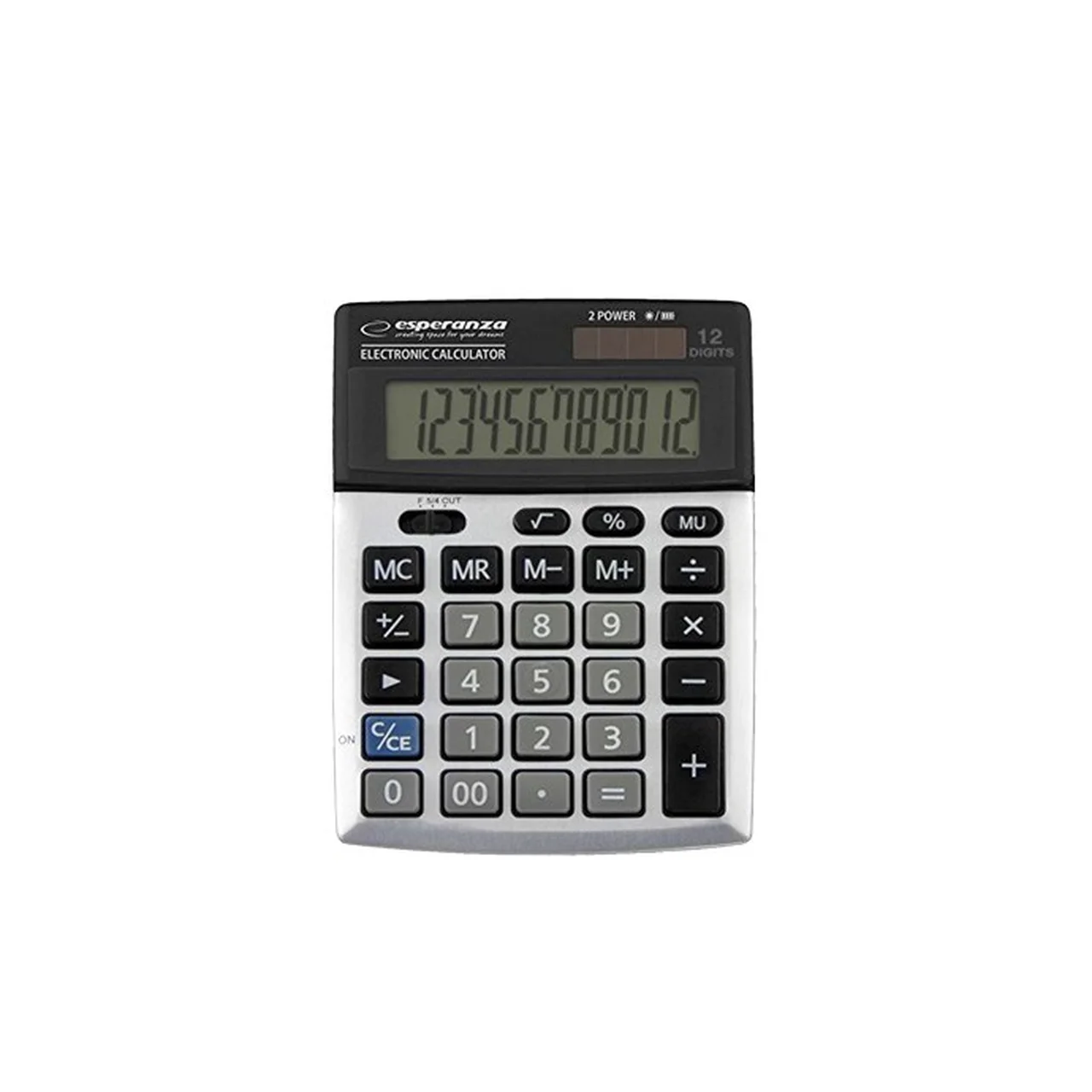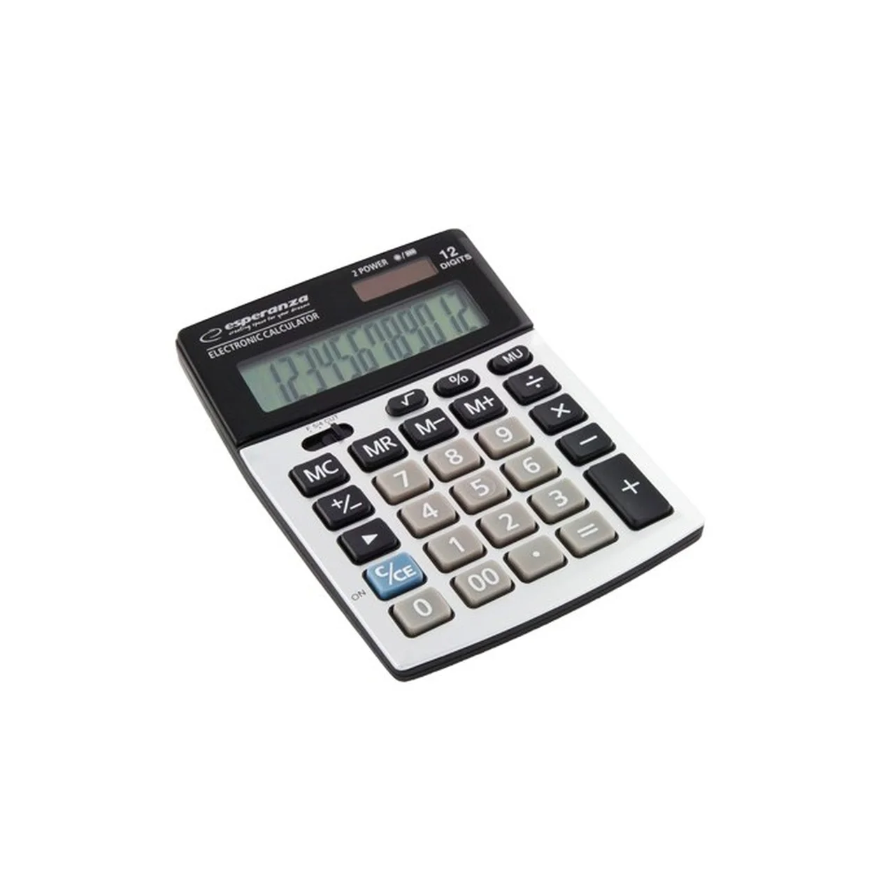 Esperanza ECL102 on hõbedane/must lauakalkulaator 12 numbrikohaga ja kallutatud ekraaniga, mis sobib igapäevaseks kasutamiseks kontoris või kodus.