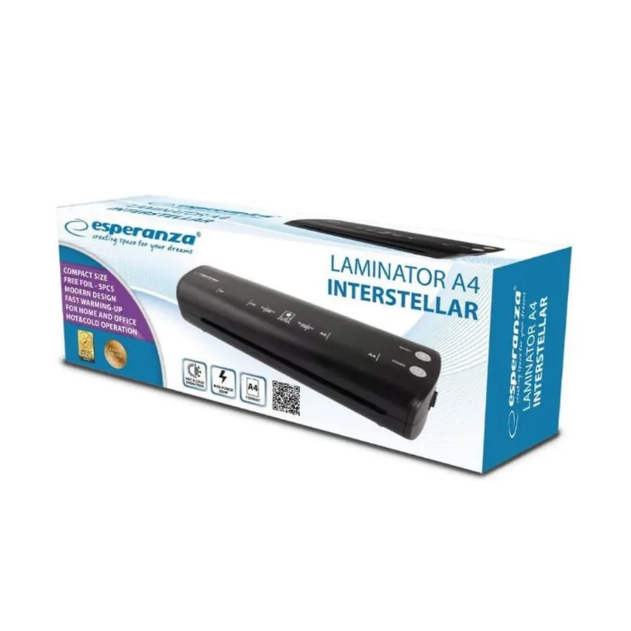 Must A4 lamineerimismasin Esperanza EFL004 sobib dokumentide ja fotode kiireks ning turvaliseks lamineerimiseks kodus või kontoris.