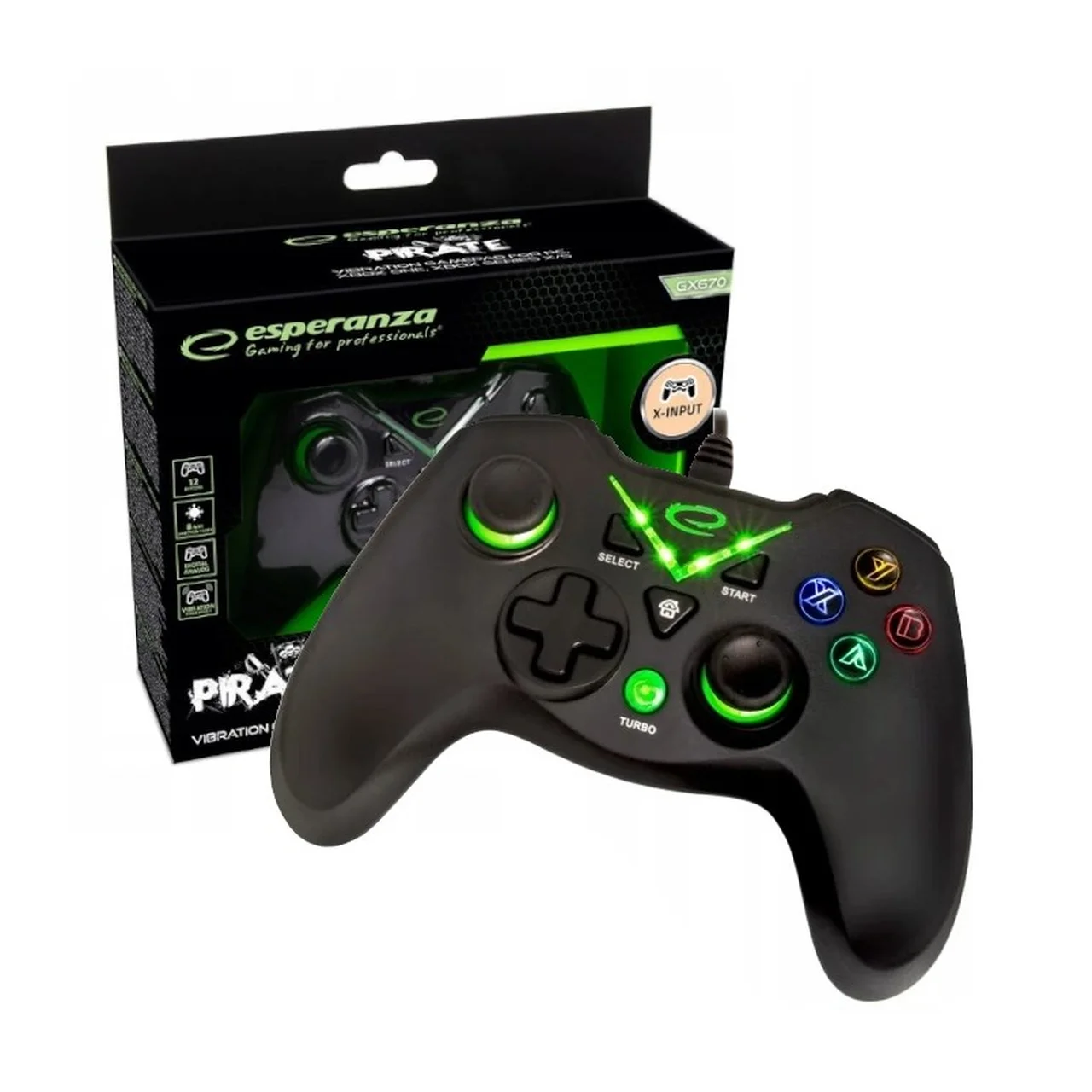 Must juhtmega Xbox gamepad Esperanza EGG114K pakub vibratsiooniefekti, 12 nuppu ja USB 2.0 ühendust, toetades PC, Xbox One ning Xbox Series S/X platvorme.