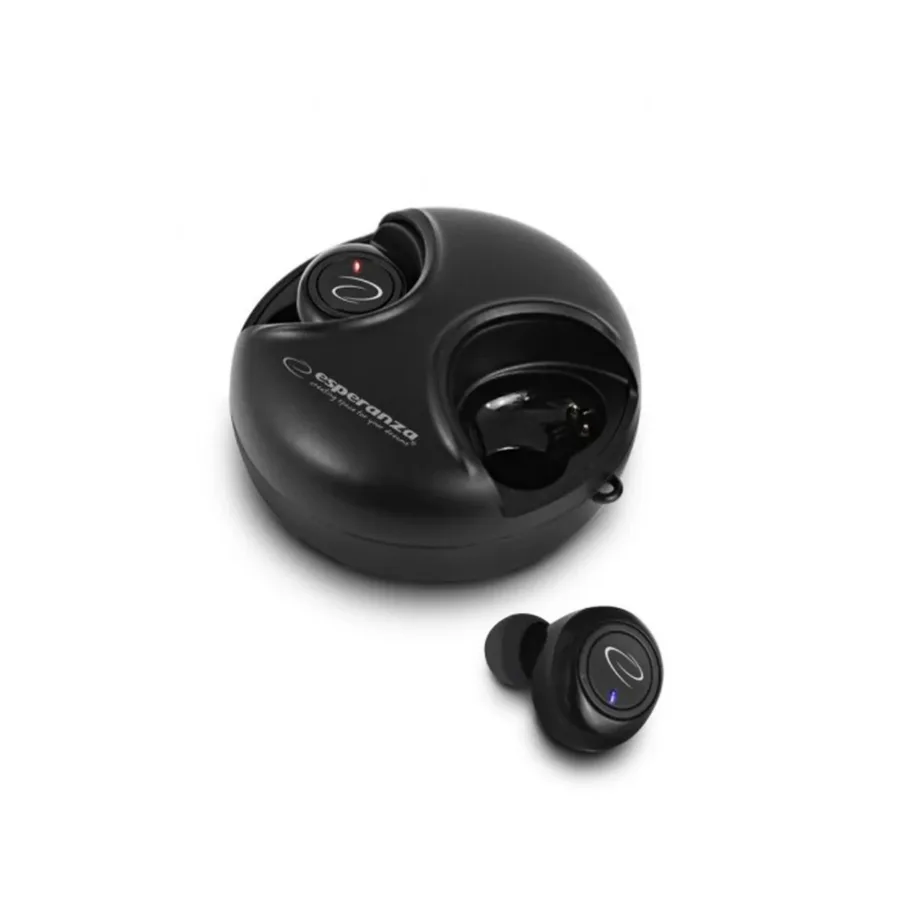 Esperanza EH228K on mustad juhtmevabad kõrvasisesed kõrvaklapid Bluetooth 5.0 ühenduse ja laadimiskarbiga, sobivad muusika kuulamiseks ja käed-vabad kõnede jaoks.