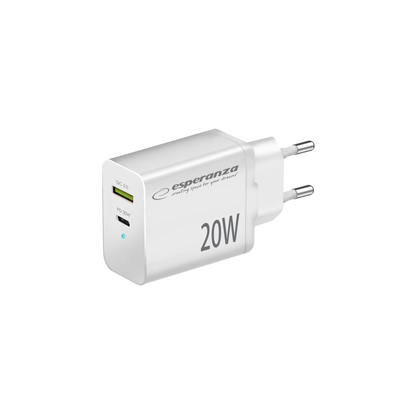 Esperanza EZC105W valge 20W USB-C ja USB-A kiirlaadija ülepinge- ja ülekuumenemiskaitsega
