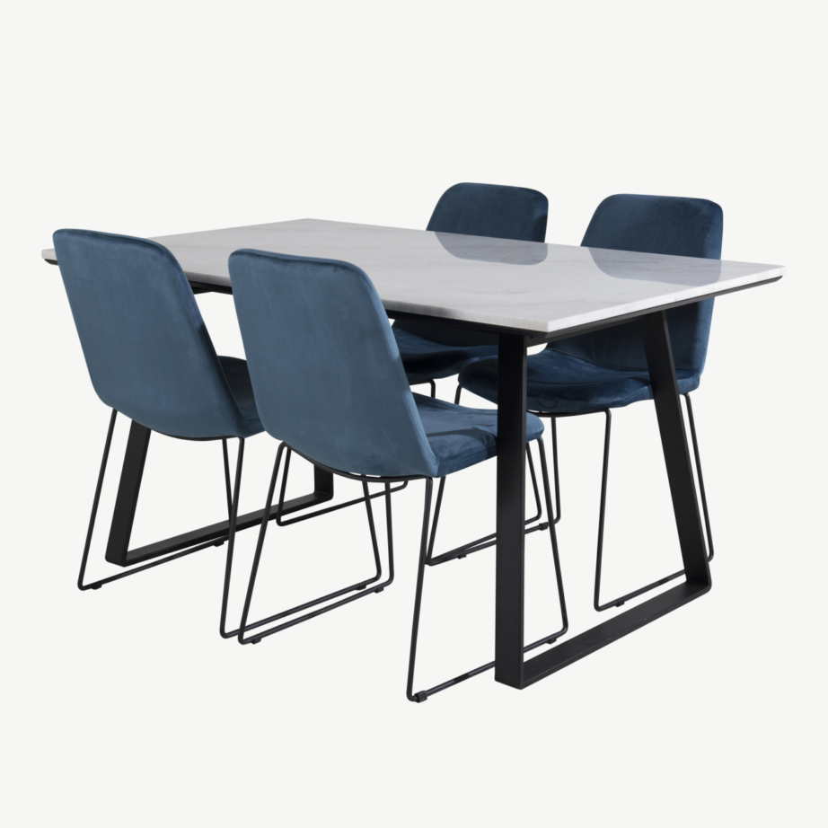 Estelle ristkülikukujuline marmorlauaga söögikomplekt koos siniste samettoolidega ühendab põhjamaise disaini, kvaliteetsed materjalid ja mugavuse. Komplekt toob Sinu söögituppa elegantsi ja hubasust, luues ideaalse keskkonna nii igapäevasteks söömaaegadeks kui ka erilisteks hetkeks pere või sõpradega. Õhulised ja kaunid toonid muudavad ruumi avaramaks ning kutsuvamaks.