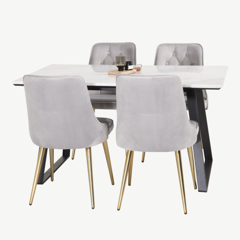 • Velvet Deluxe söögitoolid: Mugavad ning ergonoomilise kujuga toolid, mille istumispind on kaetud kvaliteetse helehalli velvetkattega (100% polüester). Kuldse viimistlusega jalad ja poroloonist sisu loovad hooletult elegantse ning mugava istumiselamuse.