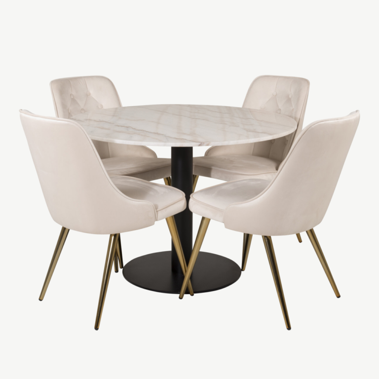 Estelle ümmargune marmorist söögilauakomplekt toob koju šiki ja ajatu ilme, ühendades luksusliku materjalivaliku ning mugavuse. Komplekti kuulub tumehallist marmorist lauaplaadiga ümmargune söögilaud ja neli pehmet beeži velvetkangaga söögitooli, mille kuldsed terasjalad lisavad ruumile särtsakust ja pidulikkust.