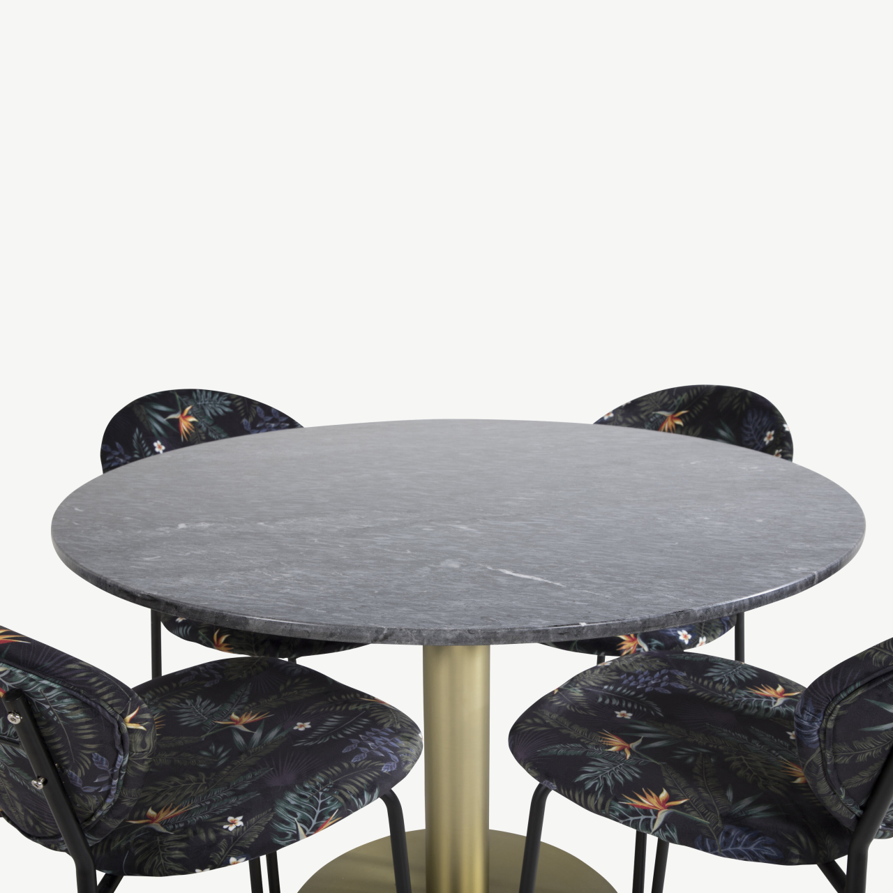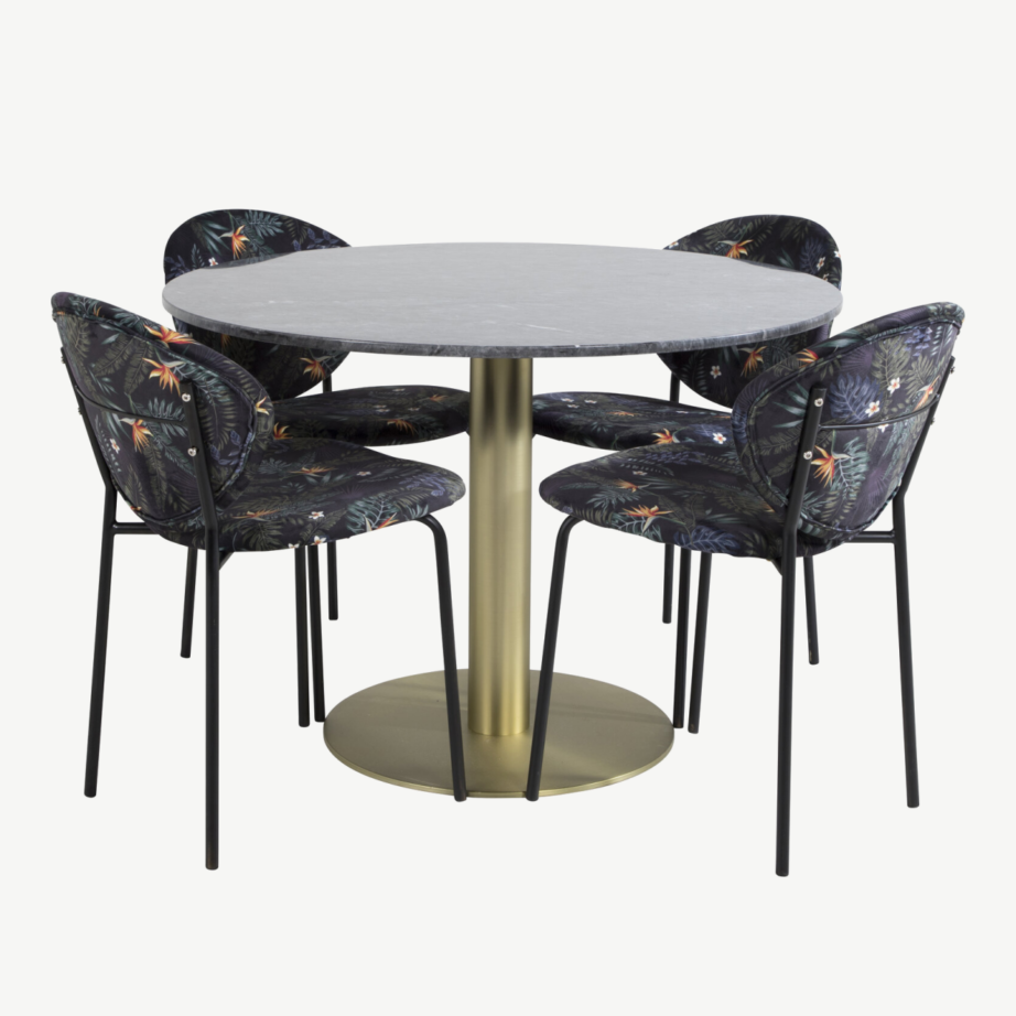 Estelle ümmargune marmorlauaga söögikomplekt loob Sinu koju põhjamaise elegantsi ja kaasaegse mugavuse. Komplekti kuuluvad pilkupüüdev tumehalli marmorkattega Estelle söögilaud ning neli Vault tooli, mille mustal metallraamil lillemustriline polster tagab nii visuaalse kui ka praktilise väärtuse. See ümmargune marmorlauaga söögikomplekt pakub loomulikku kohtumispaika nii perele kui sõpradele, luues hubase ja esteetilise ruumi ühisteks hetkeks.