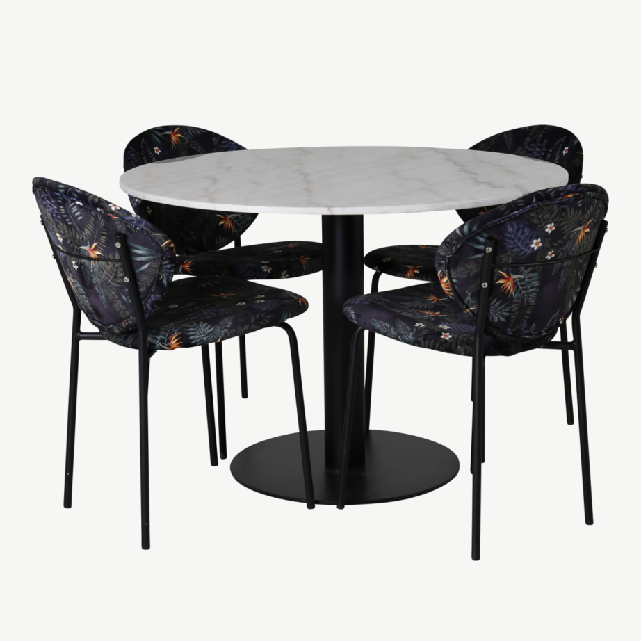 Estelle ümmargune valge söögilaud koos musta lillemustriga toolidega toob sinu koju põhjamaise disaini, kvaliteetsed materjalid ja ajatult elegantse atmosfääri. See valge ümmargune söögilaud toolidega mõjub ruumis silmapaistva keskpunktina ning sobib nii pere ühisteks söömaaegadeks kui ka külaliste võõrustamiseks.