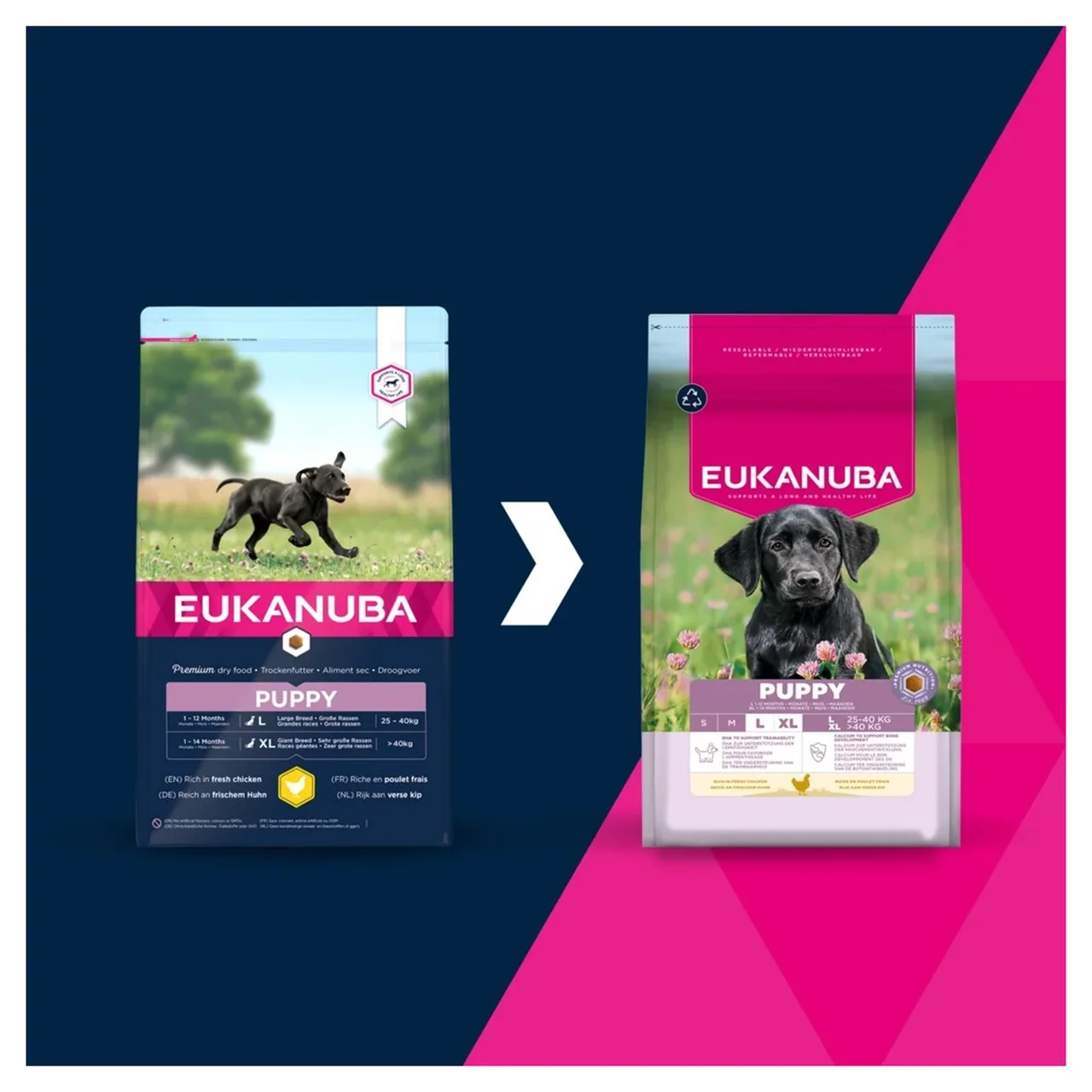 EUKANUBA Puppy L XL Rich in chicken on kuivtoit, mis on mõeldud suurte ja hiiglaslike tõugude kutsikatele kasvuperioodiks. See toit tagab kõik vajaliku kasvava koera tervise ja heaolu toetamiseks – tuginedes kvaliteetsetele koostisosadele, kõrgele valgusisaldusele ja tasakaalustatud toitainesisaldusele. Kana on retsepti põhimaitse ning peamiseks eesmärgiks on tugevdada kasvufaasis luid ja lihaseid, aidata kaasa optimaalsele kaalutõusule ning toetada kutsika loomulikku immuunsust. Toode on suhkruvaba, kunstlike värvaineteta ja ei sisalda soja.