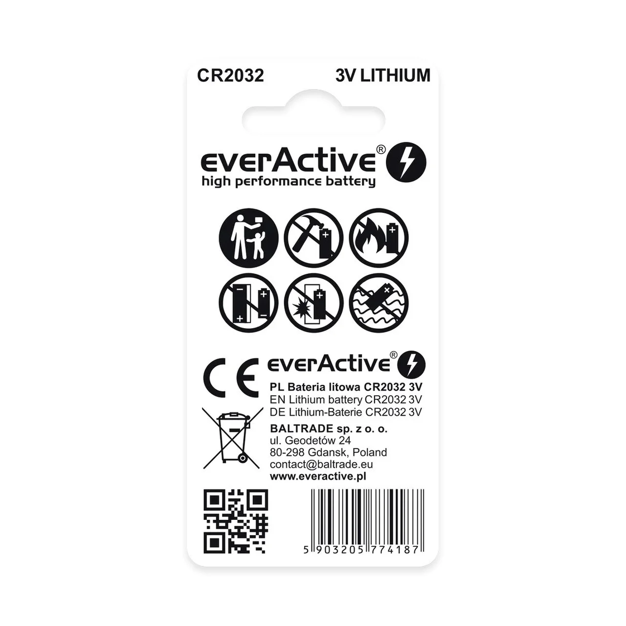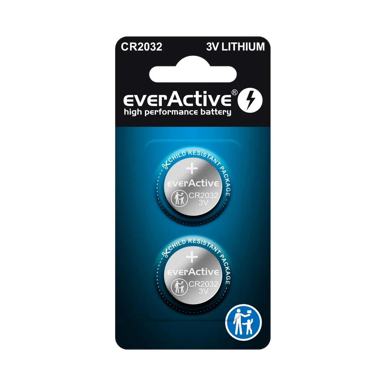 everActive CR2032 liitiumpatareid (3V, 20×3,2 mm) sobivad erinevatesse väikese energiatarbega seadmetesse – komplektis on 2 ühekordseks kasutamiseks mõeldud nööpelementi.