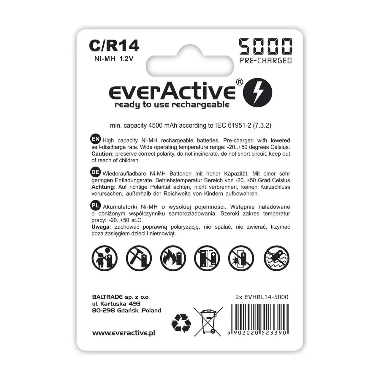 everActive EVHRL14-5000 akud sobivad seadmetele, mis nõuavad standardset R14 (C) tüüpi laetavat akut: taskulambid, mänguasjad, raadiosaatjad, juhtmeta mikrofonid, erinevad elektriseadmed. Ühildub enamiku NiMH akulaadijatega, sh everActive laadijad, tänu standardsele suurusele ja pingele.