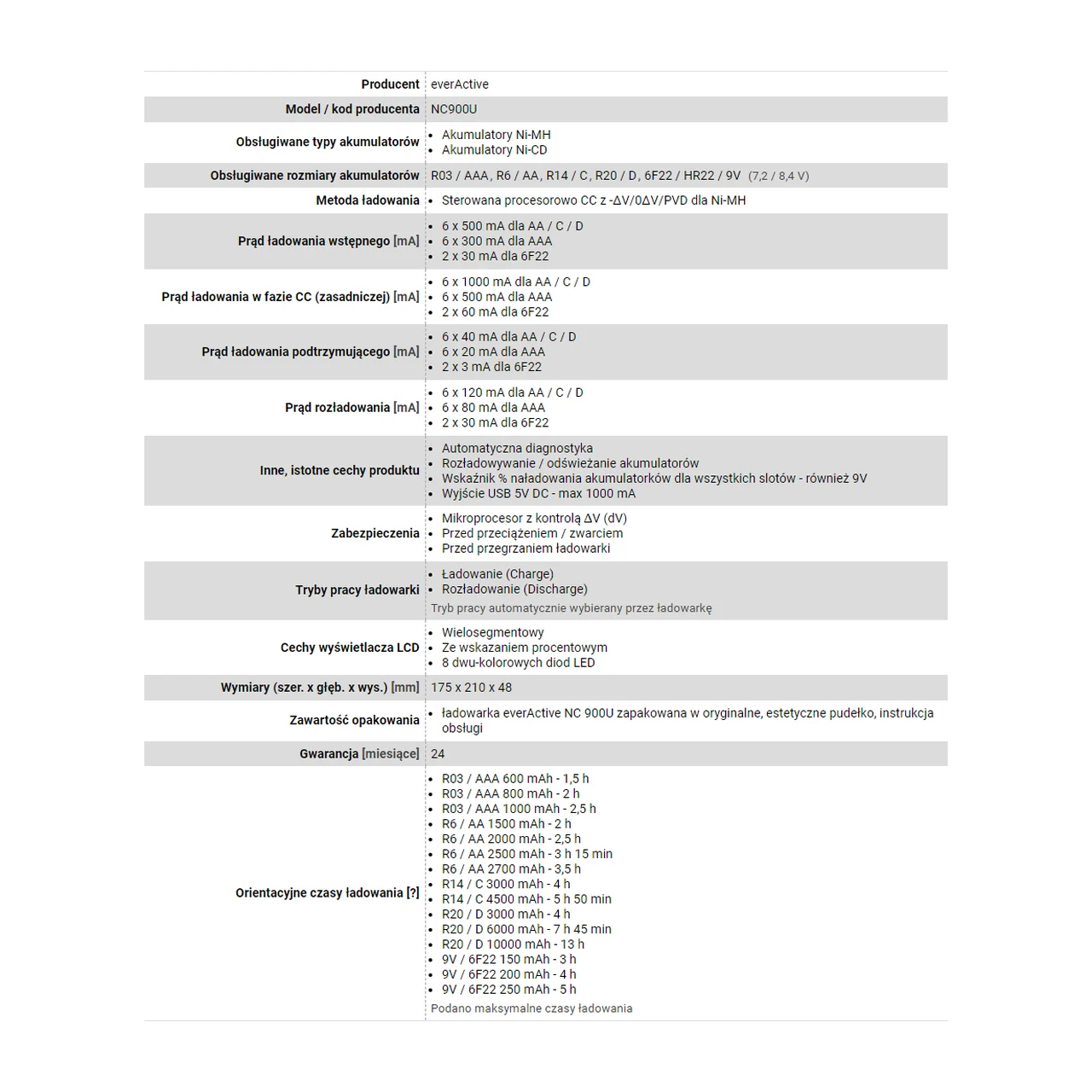 everActive NC-900U on töökindel ja turvaline kodulahendus, mida iseloomustab lai kasutusspekter. Seadmele kehtib 24-kuuline tootjapoolne garantii. Tänu efektiivsele laadimisele ja intelligentsetele kaitsefunktsioonidele aitab seade säästa raha ja toetab keskkonda, kuna vähendab vajadust osta uusi patareisid.