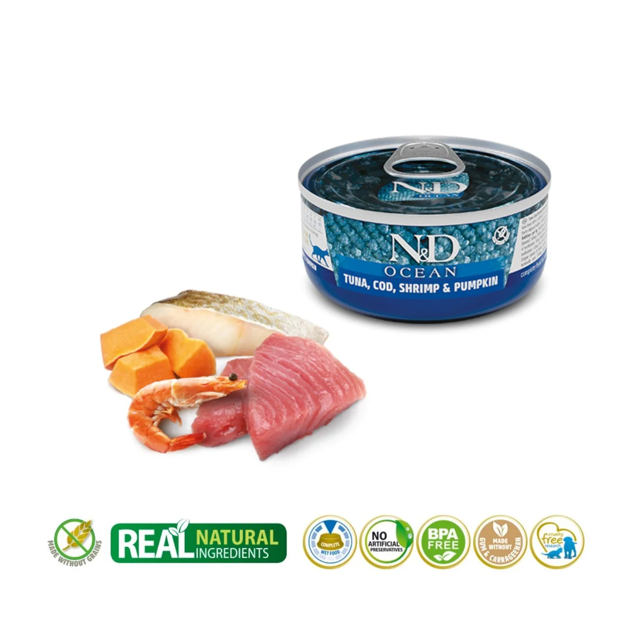 Farmina N&D Ocean tuunikala, tursa, krevettide ja kõrvitsaga teraviljavaba märgtoit kassile