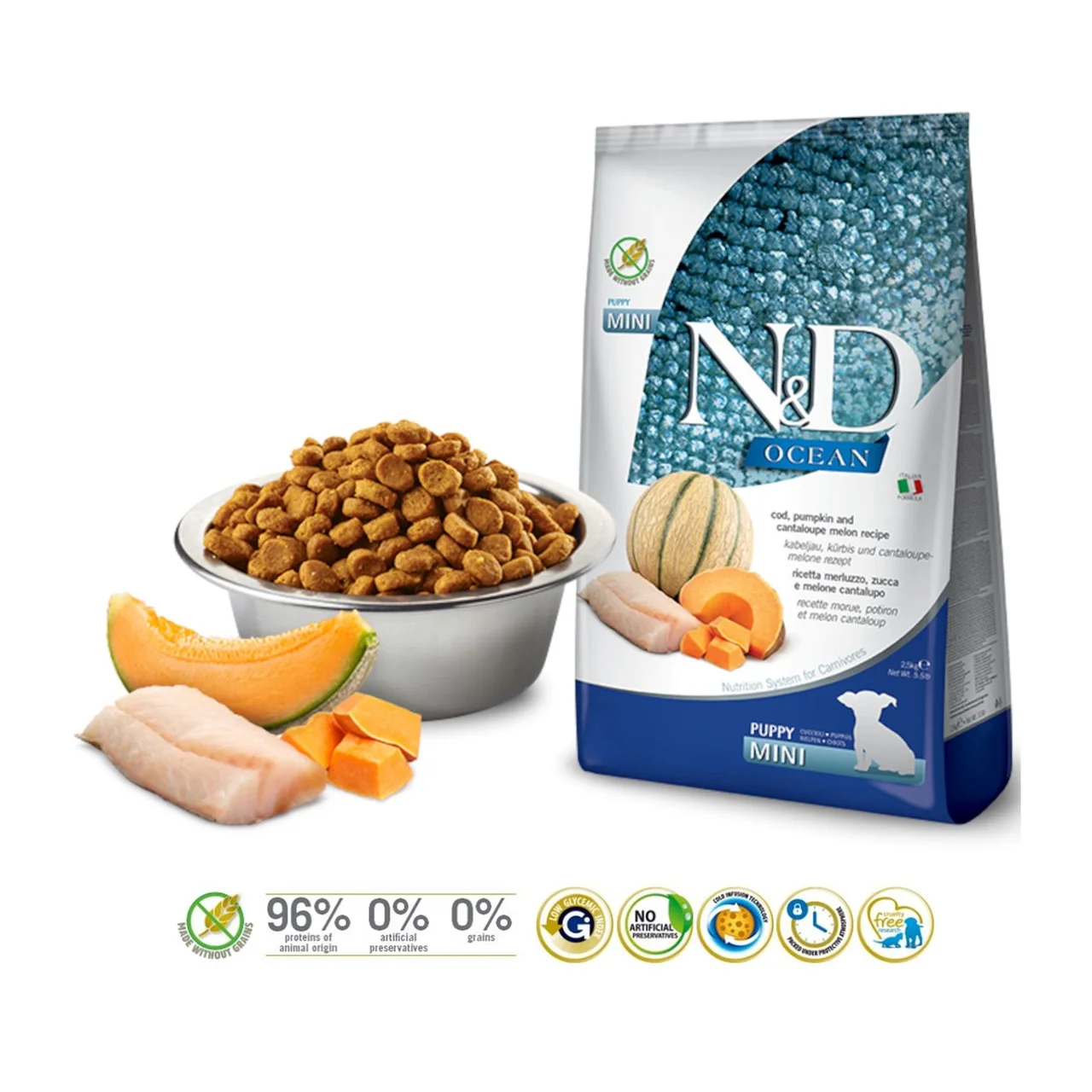 Farmina N&D Ocean Dog Cod, Pumpkin & Cantaloupe Melon Puppy Mini on kvaliteetne ja tasakaalustatud kuivtoit väikest tõugu kutsikatele ning sobib hästi ka tiinetele ja imetavatele emastele koertele. Tegemist on teraviljavaba, gluteenivaba ja kanavaba retseptiga, mis põhineb tursal, kõrvitsal ja melonil, pakkudes kutsika kasvuperioodiks vajalikku toiteväärtust. See toit toetab üldist tervist, tugevdab immuunsust ja soodustab lihaste arengut. Toode sobib eriti hästi väikest tõugu koertele kehakaaluga 5–10 kg, nagu malta koer.