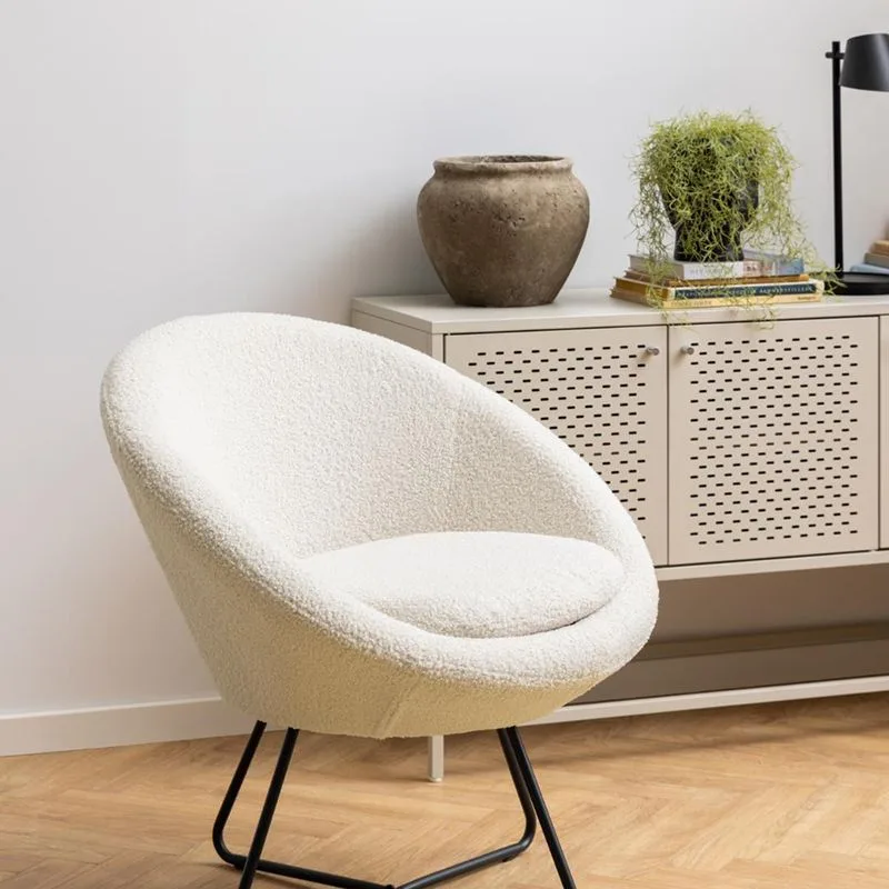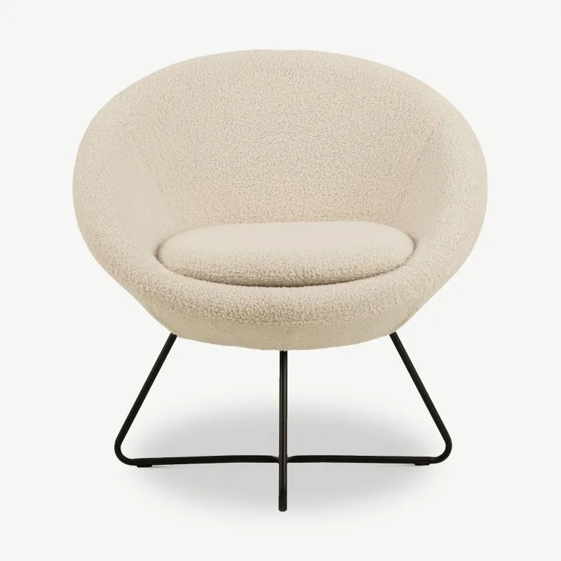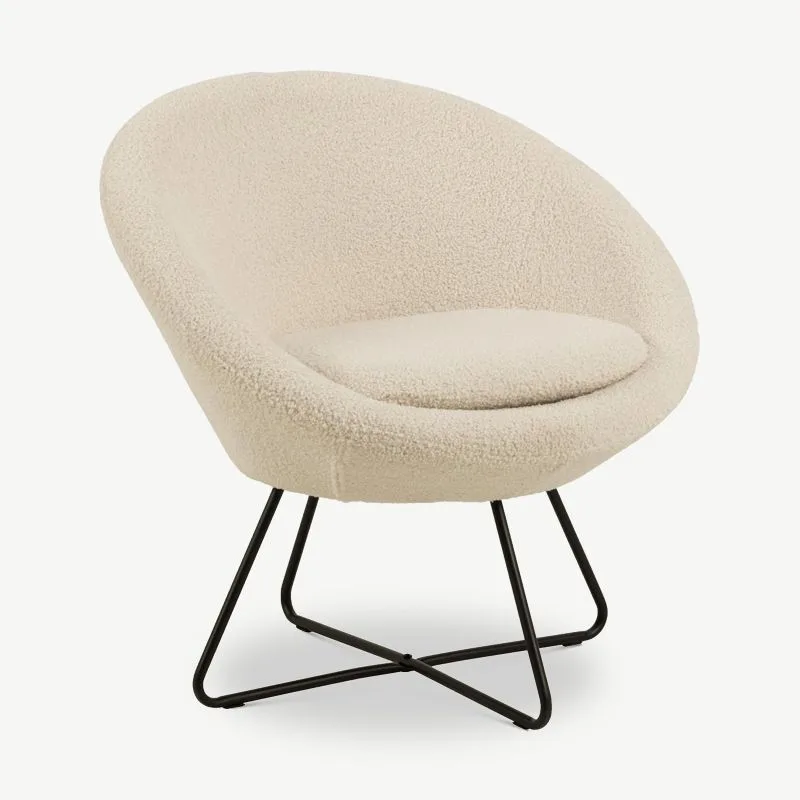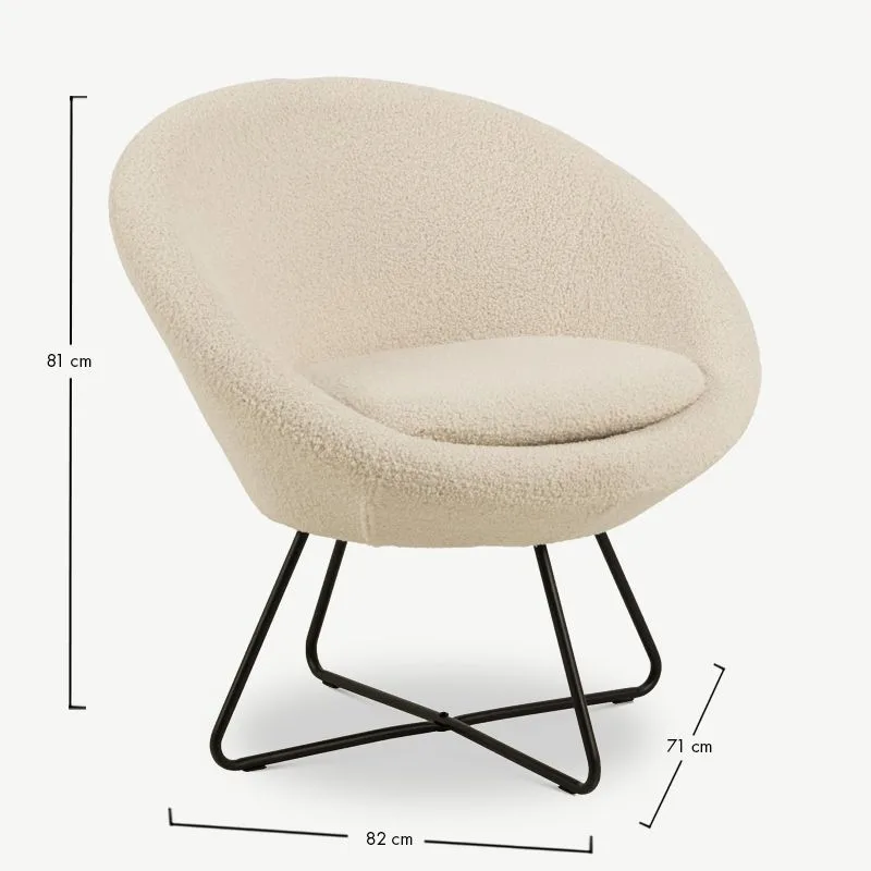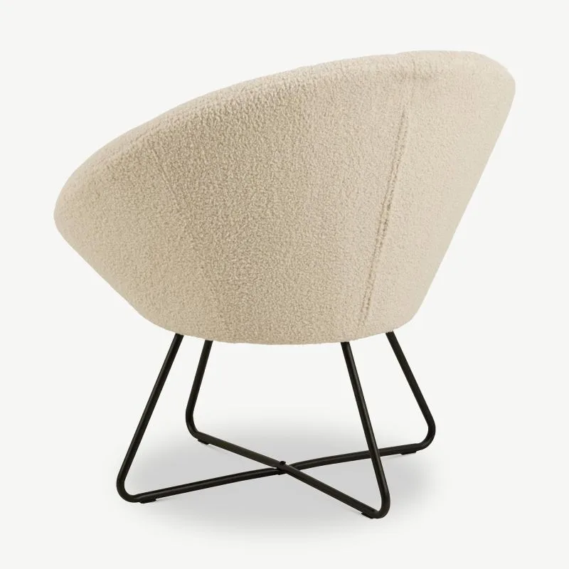 See tugitool ühendab kreemja bukleekanga ja musta matistatud metalli, luues modernse, kuid samas ajatu kombinatsiooni. Selle erakordne ümara kujuga iste ja väljendusrikas ristjalaga raam annavad toale iseloomu ning muudavad mööblieseme tõeliseks pilgupüüdjaks.
