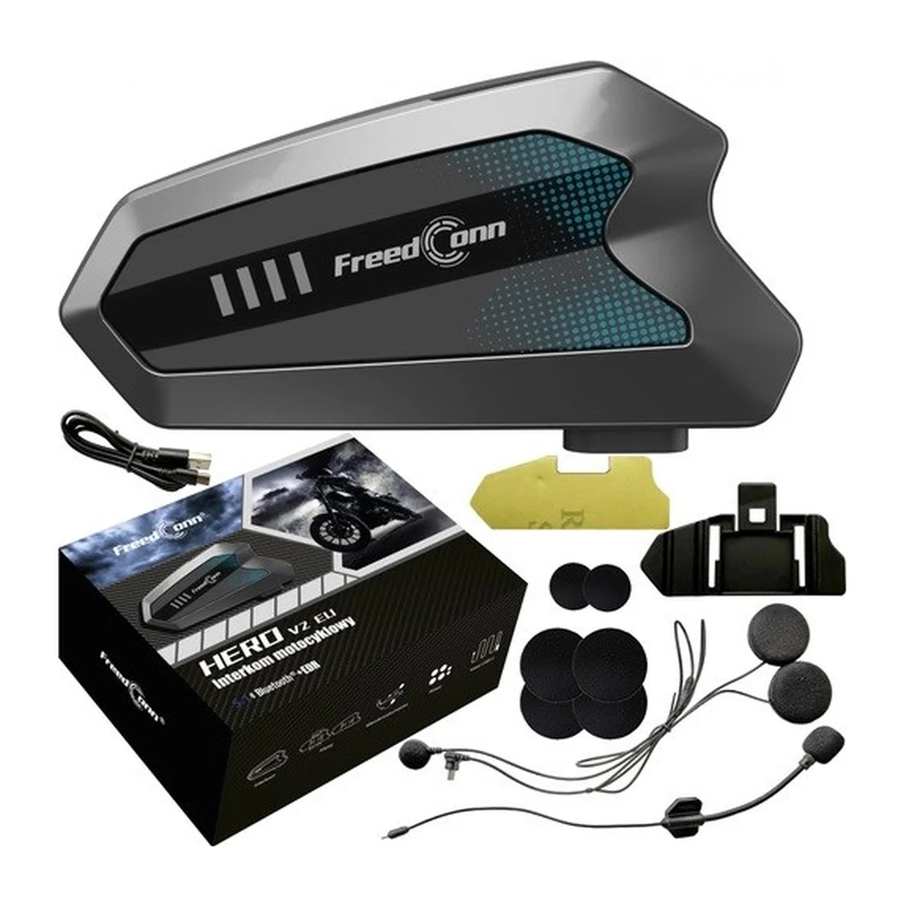 - Komplektis on: FreedConn HERO V2 EU intercom, 2 mikrofoni, kõlarid, kinnitusklamber ja -kleebis, MicroUSB-kaabel, kasutusjuhend.