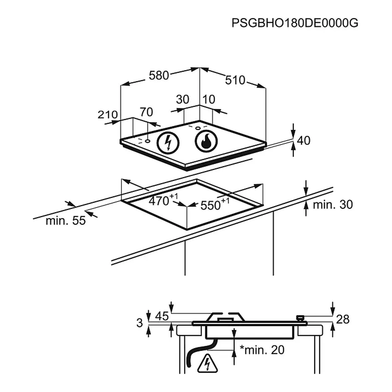 - Pliidiplaat on mõeldud pealse paigalduseks töötasapinna avasse, mis vastab tootja paigaldusjoonisel toodud mõõtudele.