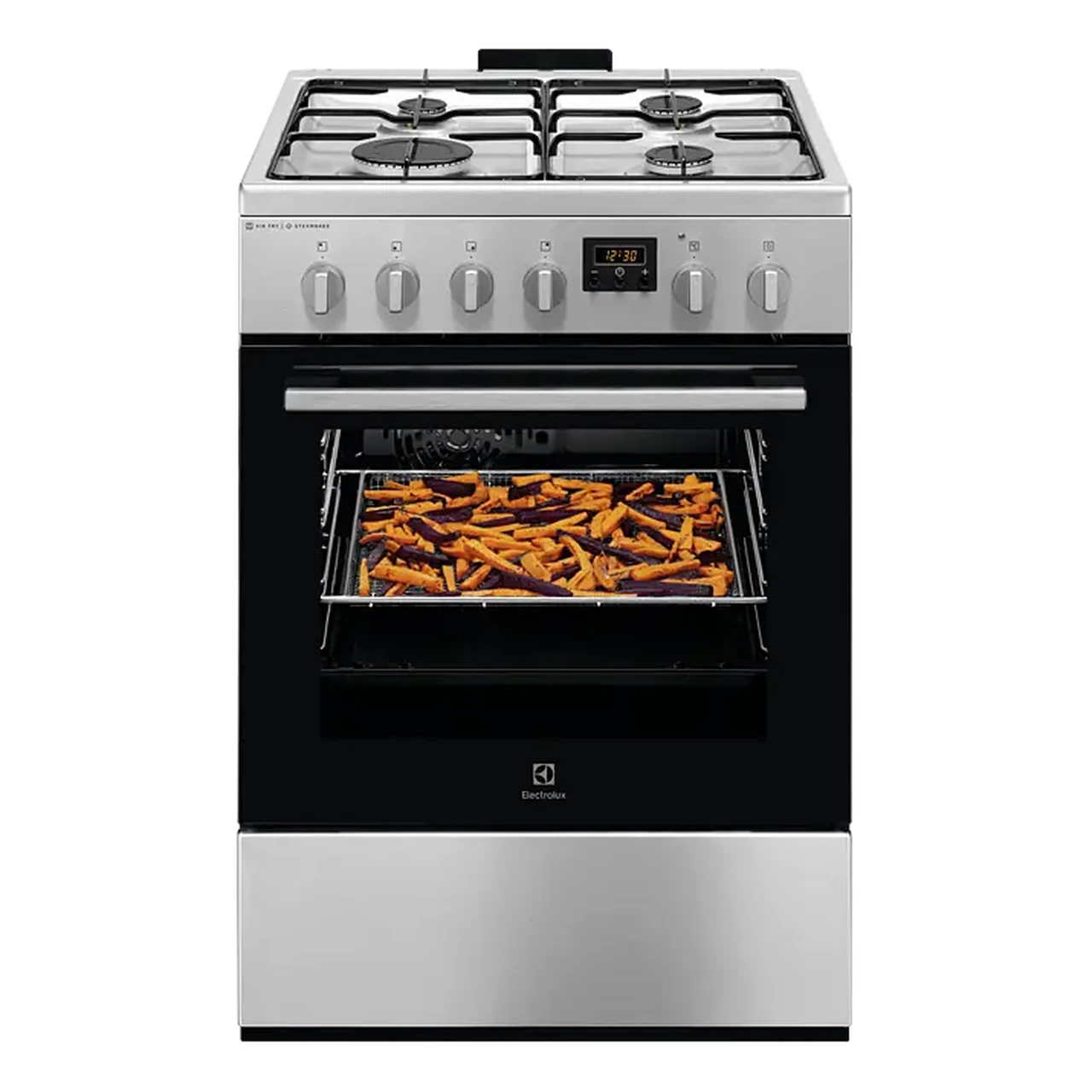 Electrolux LKK660221X on 60 cm lai gaasipliit elektriahjuga, mis ühendab kiire gaasikeedupinna ja mitmekülgse elektriahi. SteamBake lisaauru funktsioon parandab küpsetiste kerkimist ja koorikut, AirFry režiim võimaldab valmistada krõbedaid roogasid väiksema rasvakogusega ning pöördõhu abil küpsetad korraga mitmel tasandil ühtlaselt.