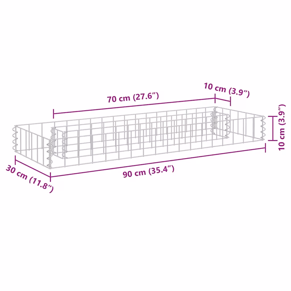 Komplekti kuulub üks tsingitud terasest gabioon-taimelava välismõõtmetega 90 x 30 x 10 cm ning sisemõõtmetega 70 x 10 x 10 cm. Täitematerjal ja taimed ei ole komplektis.