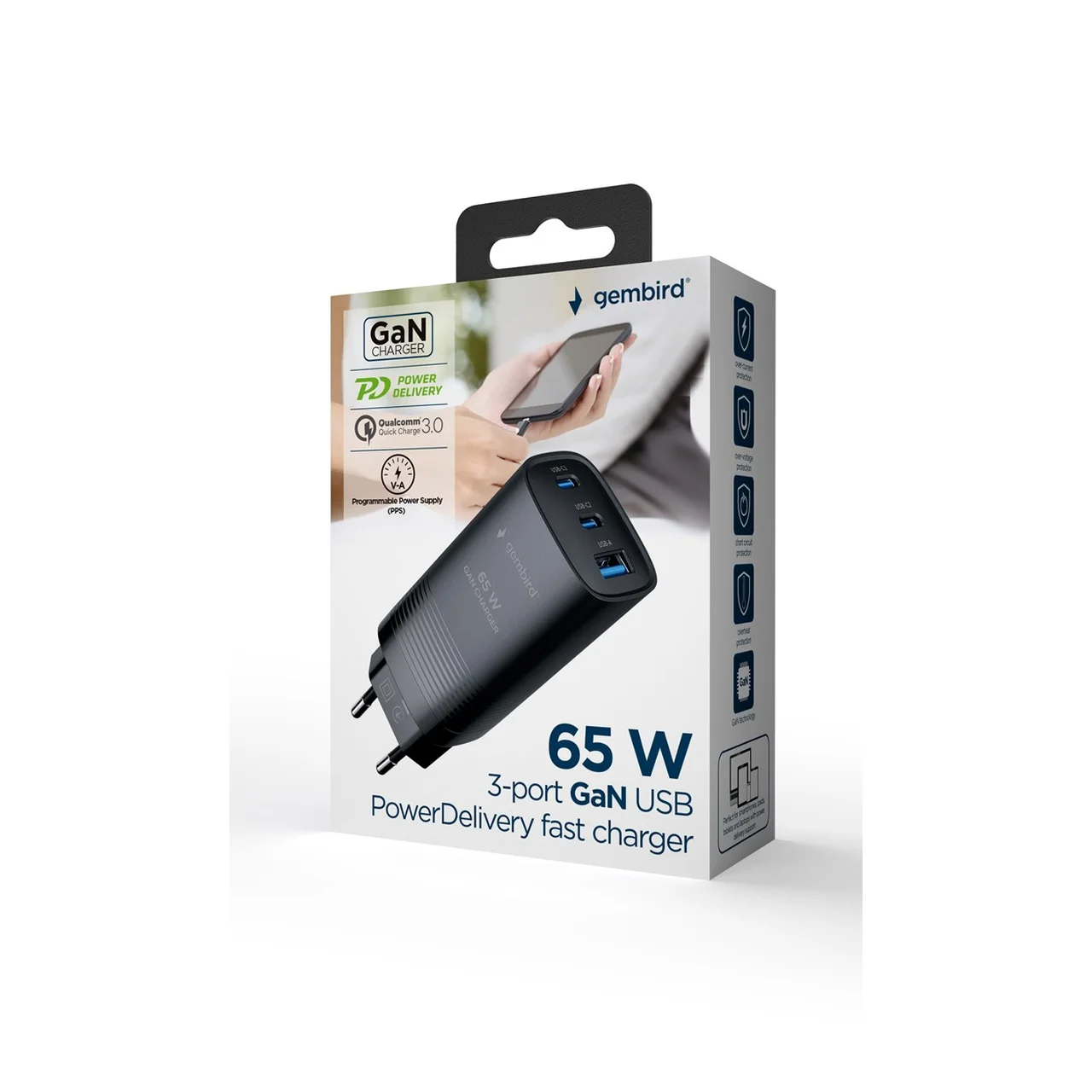 Gembird TA-UC-PDQC65-01-BK must 65 W 3-pordiline USB-C/USB-A kiirlaadija