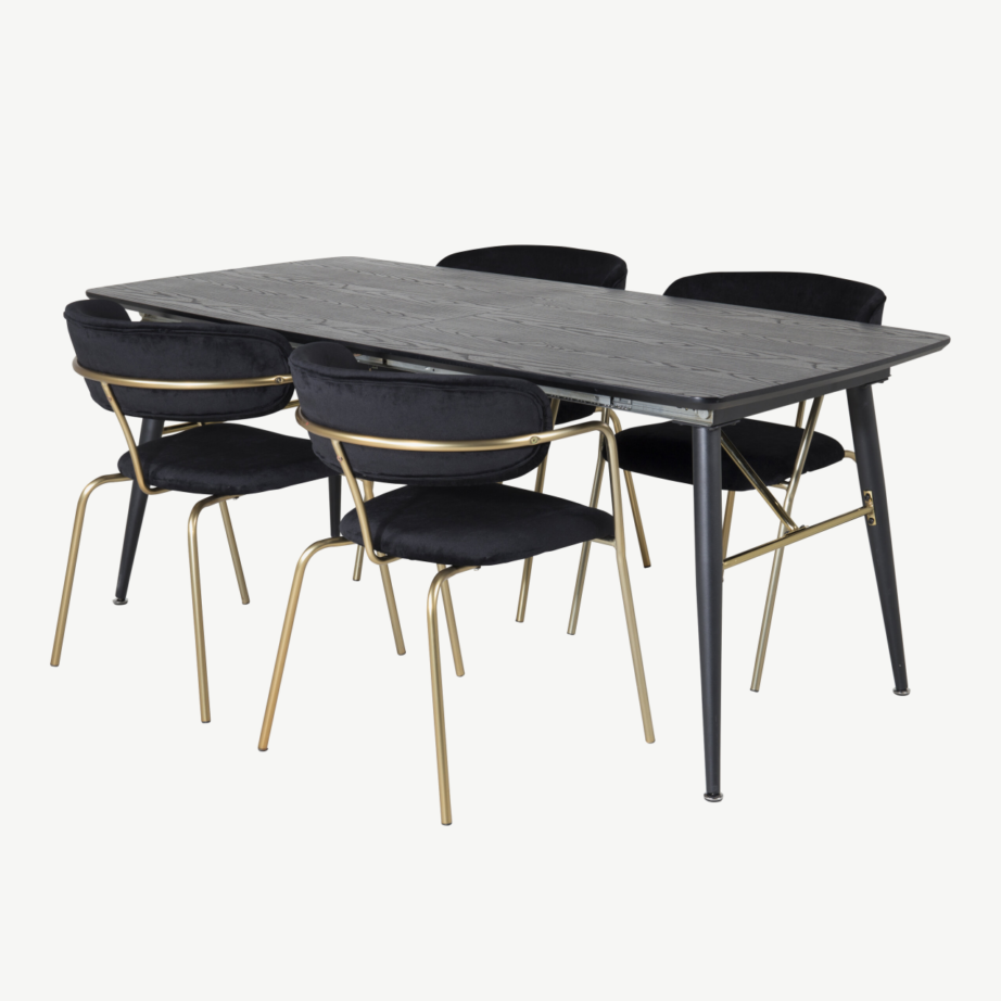 Muuda oma söögituba elegantseks ja pilkupüüdvaks musta pikendatava söögilauakomplektiga Gold, mis ühendab kaasaegse põhjamaise disaini, kvaliteetsed materjalid ja luksuslikud messingudetailid. Komplekt sobib ideaalset nii modernsesse kui ka avatud köögiga interjööri, kus väärtustatakse stiilsust ja praktilisust.