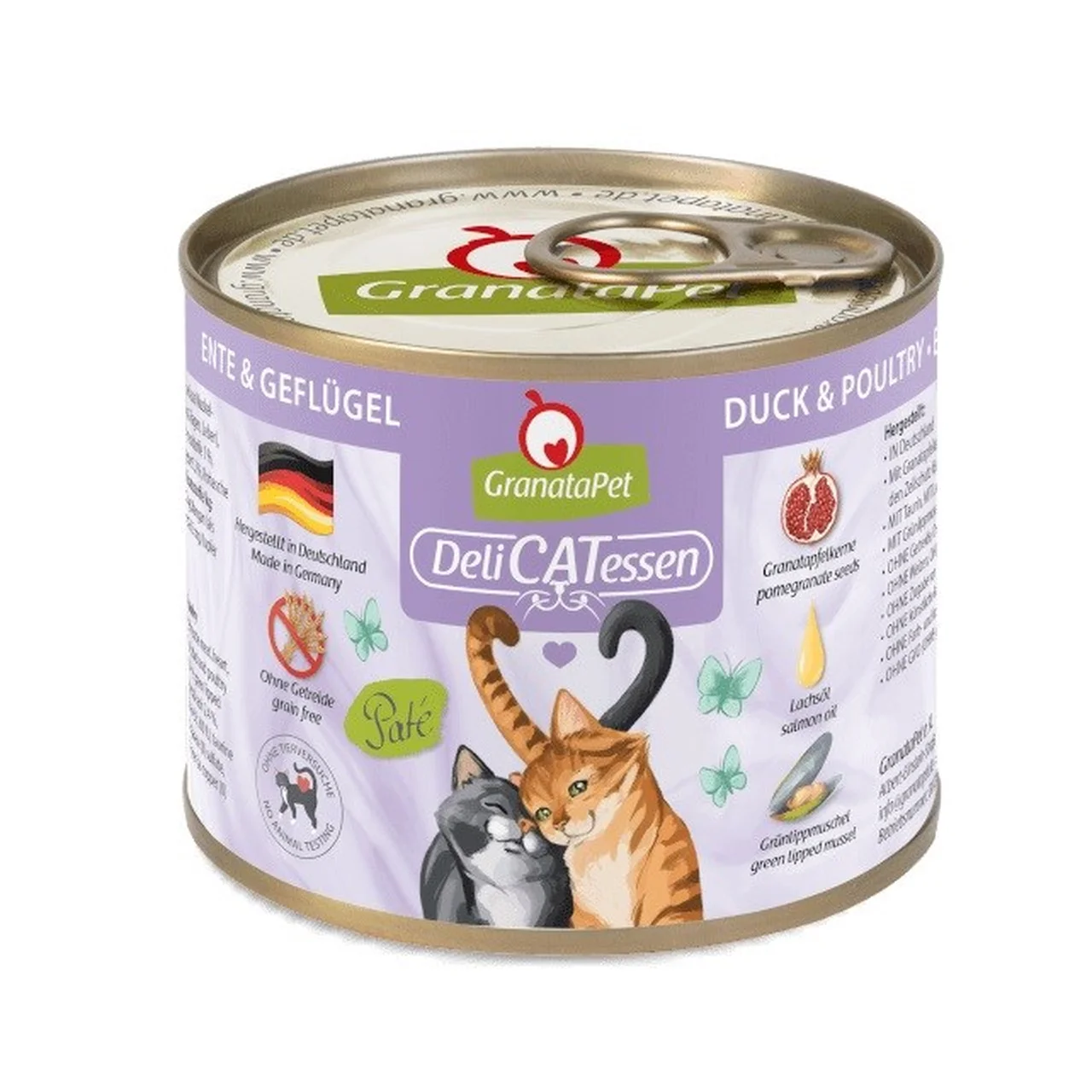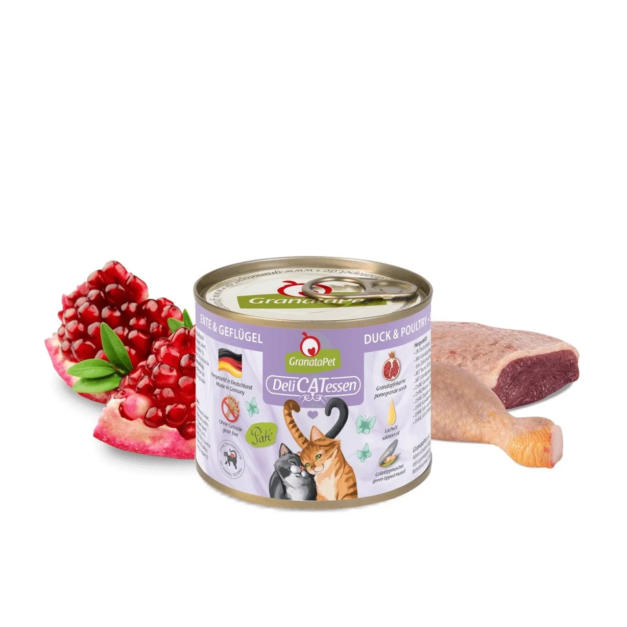 GranataPet DeliCATessen Duck and Poultry on kvaliteetne, täisväärtuslik märgtoit, mis sobib igat tõugu täiskasvanud kassile. See sojavaba, gluteeni- ja teraviljavaba toit vastab tundliku seedimise või toiduallergiatega kasside vajadustele, aidates vähendada toidutalumatuse sümptomeid ning toetades lemmiku üldist tervist. Toode sisaldab ainult looduslikke koostisosi: kvaliteetset pardi- ja linnuliha, granaatõunaseemneid, lõheõli ning rohekarbi ekstrakti. GranataPet märgtoit on valmistatud Saksamaal ning ei sisalda kunstlikke lõhna-, maitse- ega värvaineid. Tänu täielikule koostise tasakaalule sobib see igapäevaseks peatoiduks ka allergilistele kassidele.