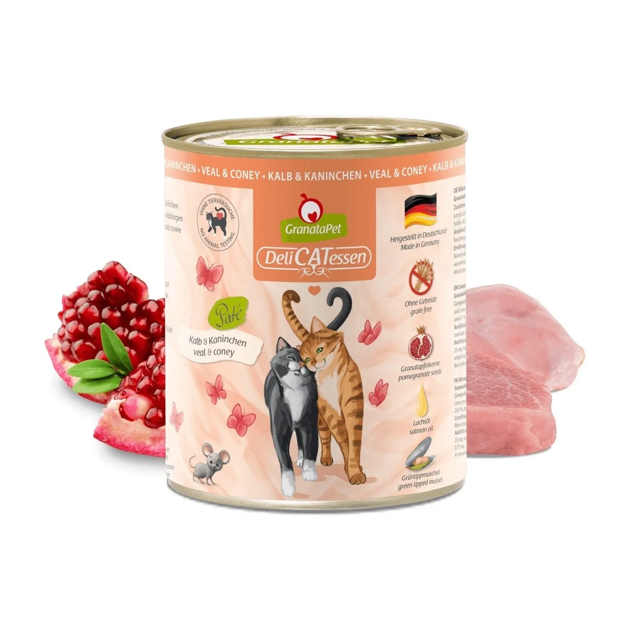 GranataPet DeliCATessen Veal and Coney märg kassitoit on kvaliteetne täissööt täiskasvanud kassidele, mis on mõeldud just neile, kellel on tundlik seedimine või kalduvus toiduallergiatele. Tootja Fox4Pets keskendub looduslikule koostisele ja kergesti seeditavale retseptile, et toetada iga kassi tervist ja heaolu. Tänu gluteeni-, suhkru- ja sojavabale koostisele sobib see konserv eriti hästi ka valivatele või talumatustega lemmikutele.