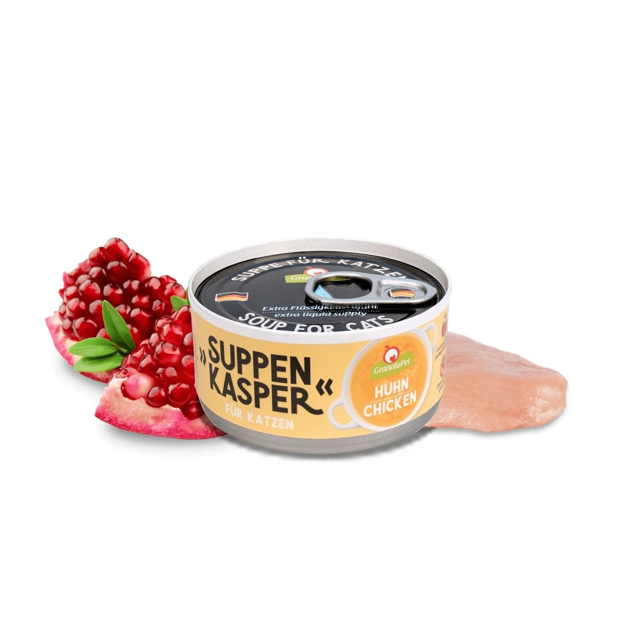 GranataPet Suppenkasper Chicken on teraviljavaba vedel kanaliha maius täiskasvanud kassidele, mis sobib hästi vedelikupuuduse ja allergiaga lemmikutele.