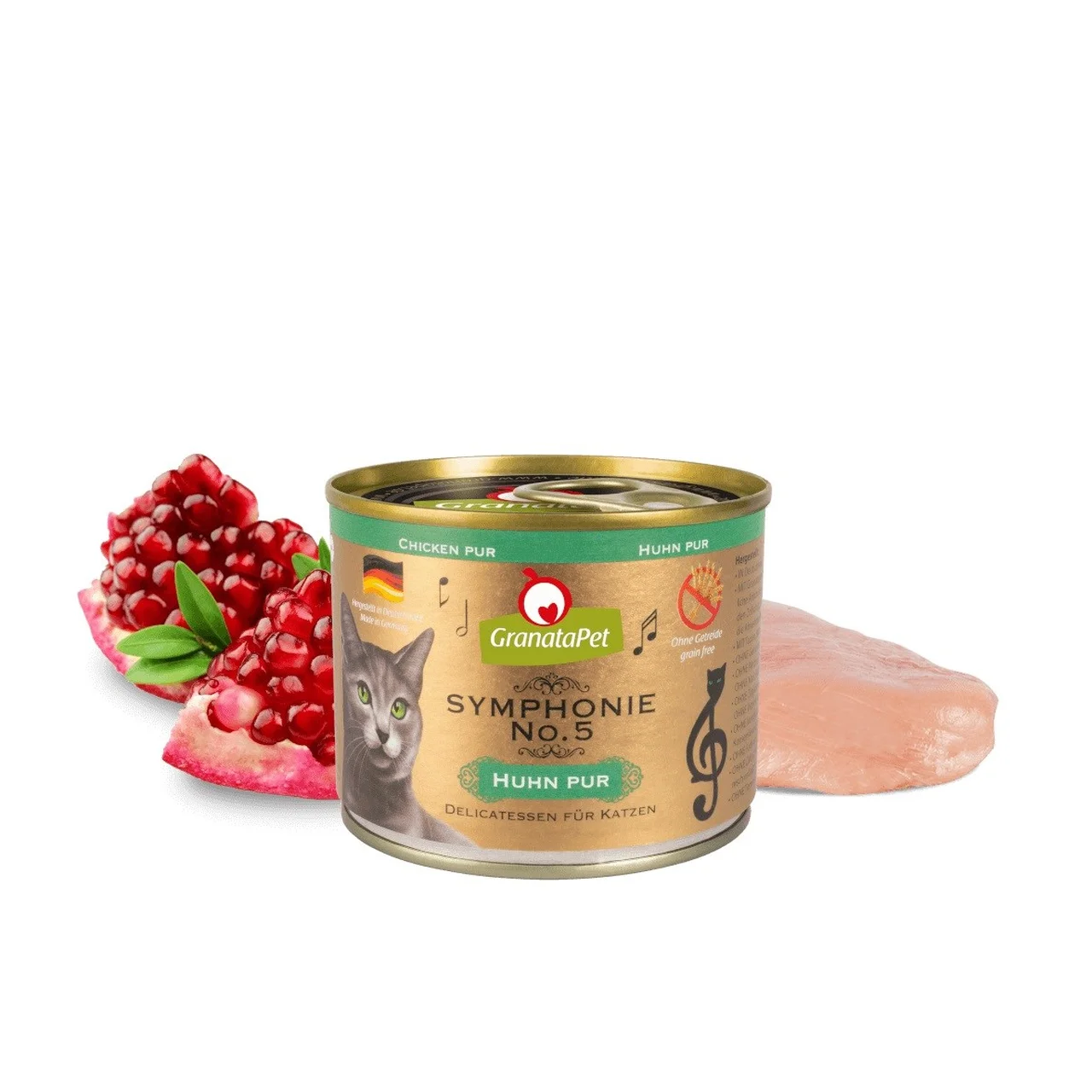 GranataPet Symphonie No.5 Chicken on Saksamaal toodetud täisväärtuslik märgtoit täiskasvanud kassidele, kellel esineb toiduallergiat, toidutalumatust või tundlikku seedimist. Toode sobib igat tõugu kassidele, pakkudes kõrge lihasisalduse ja puhta koostisega tasakaalustatud toitumist. See konserv on kana baasil, teravilja- ja gluteenivaba ning sobib hästi allergilistele või tundliku seedimisega kassidele. GranataPet Symphonie seeria rõhutab puhtaid koostisosi – ei sisalda sojat ega kunstlikke värvaineid, samuti puudub lisatud suhkur või säilitusained.