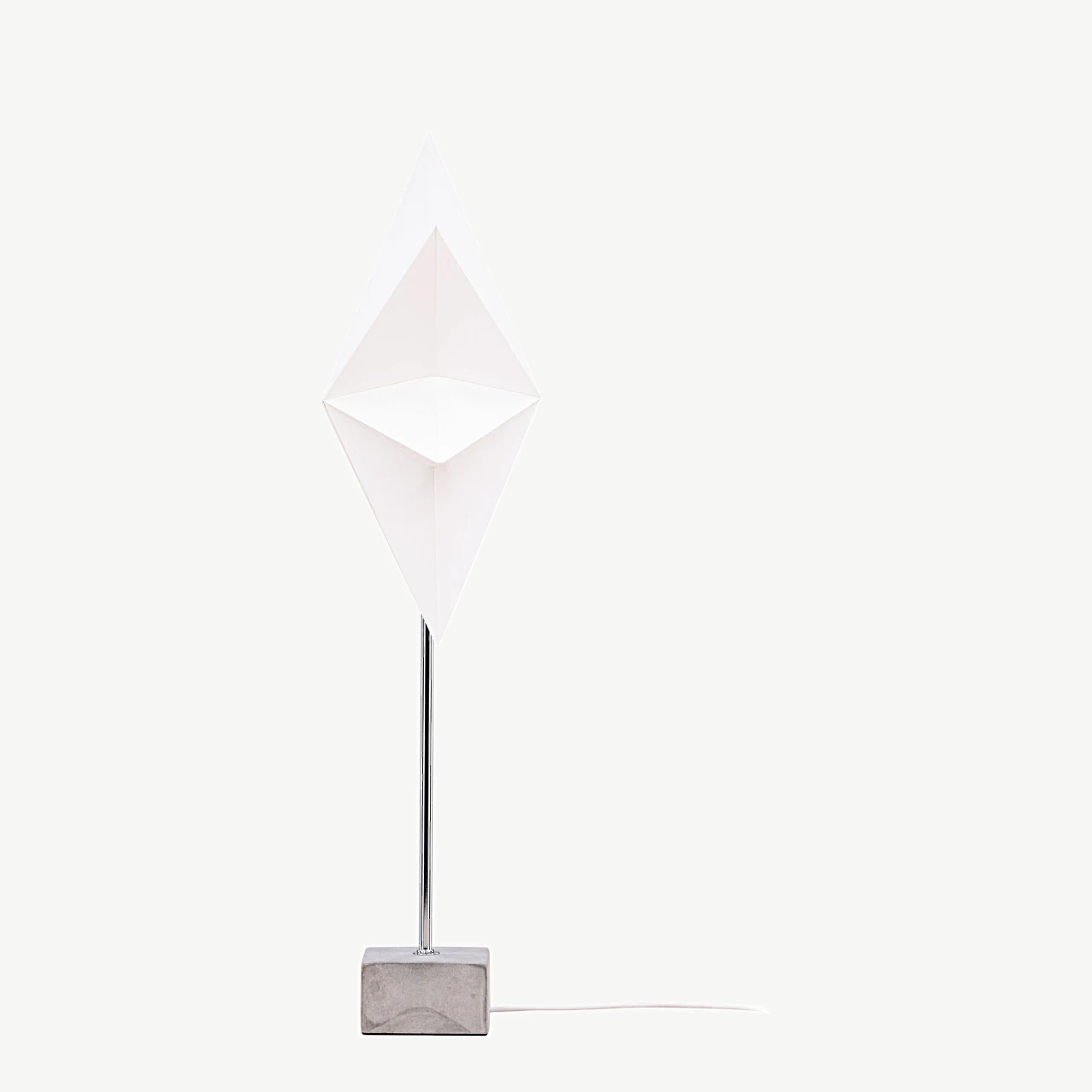 - Põhimaterjalid: valge paber (lambivarjund), must teras (vars), hall alus