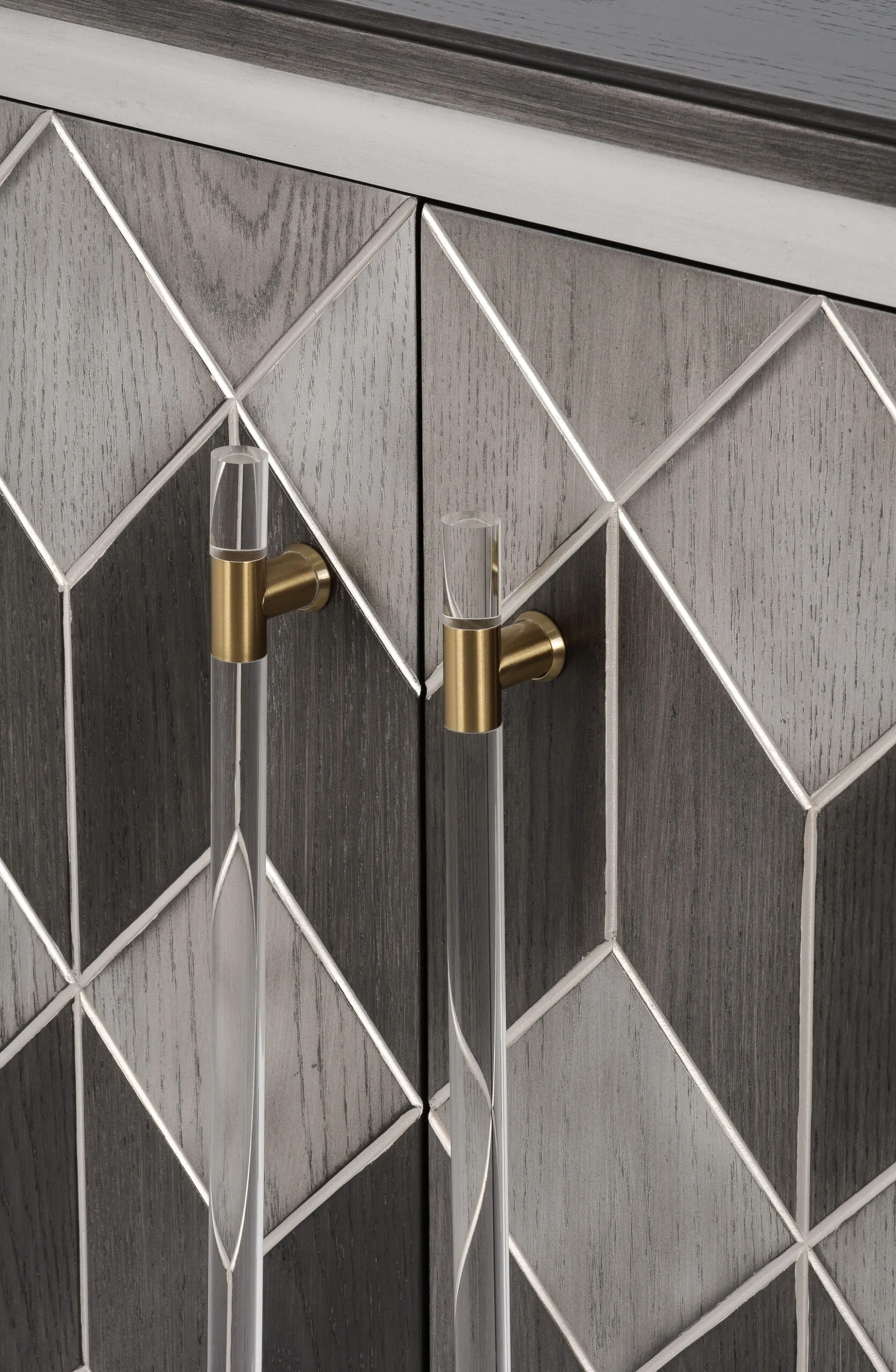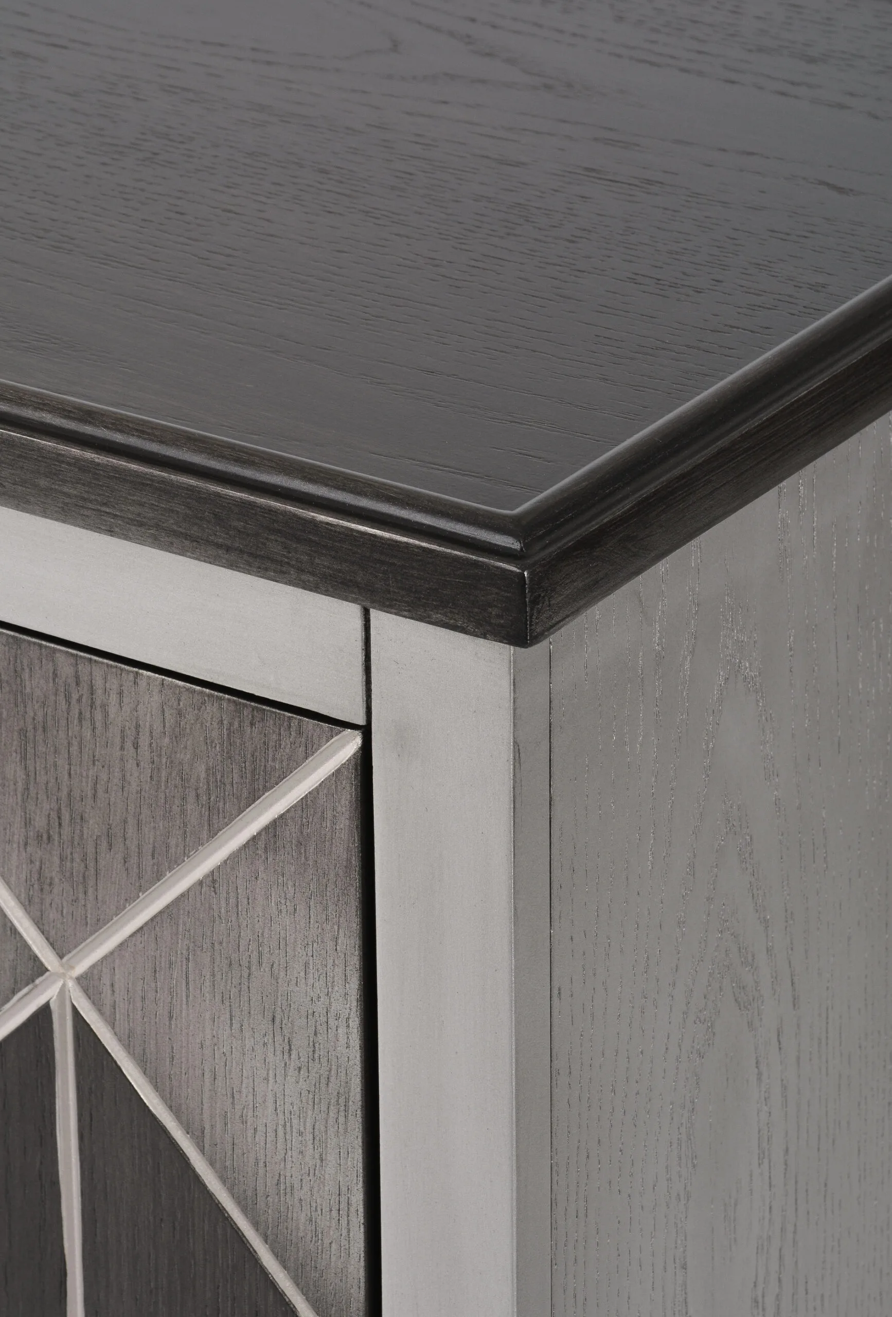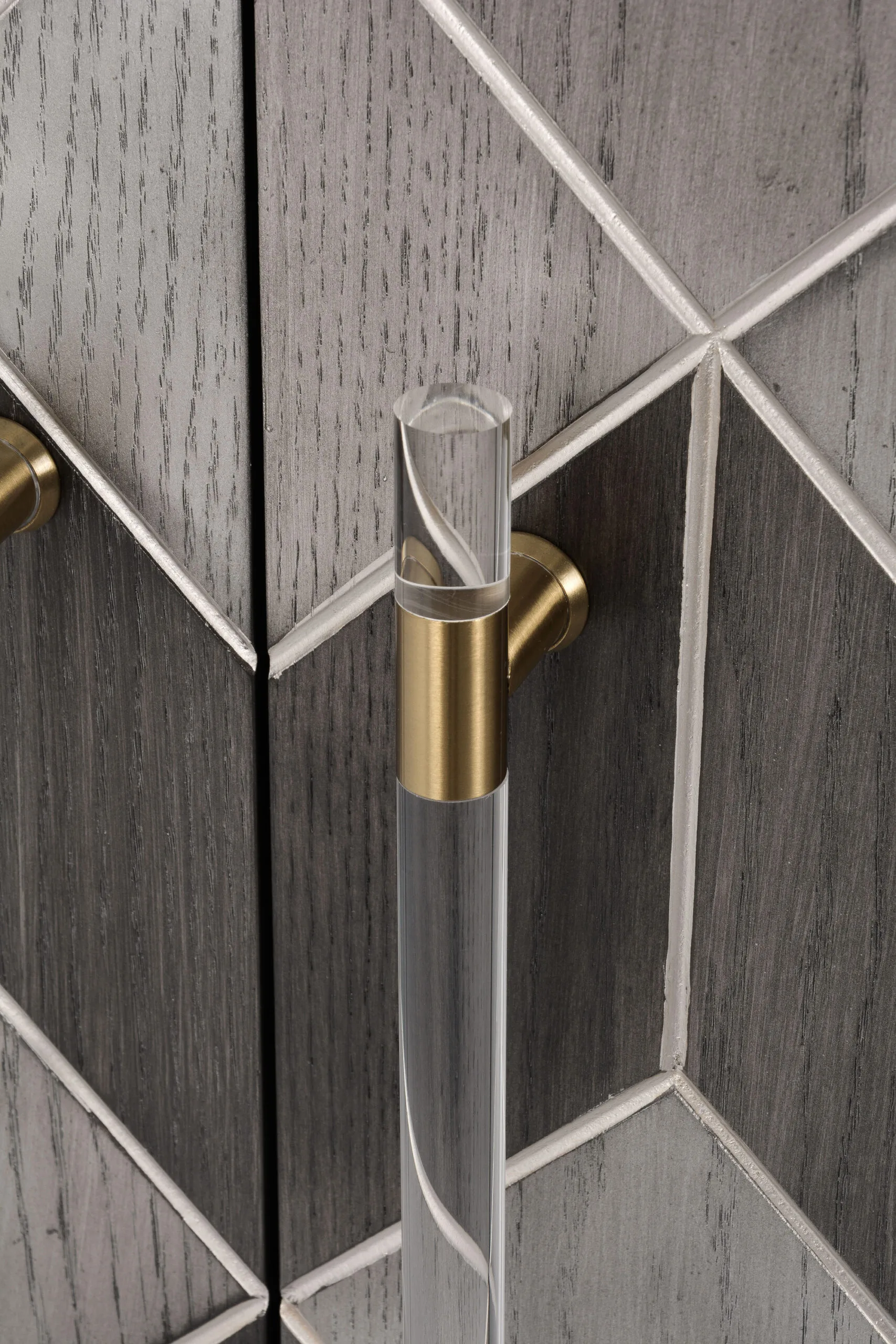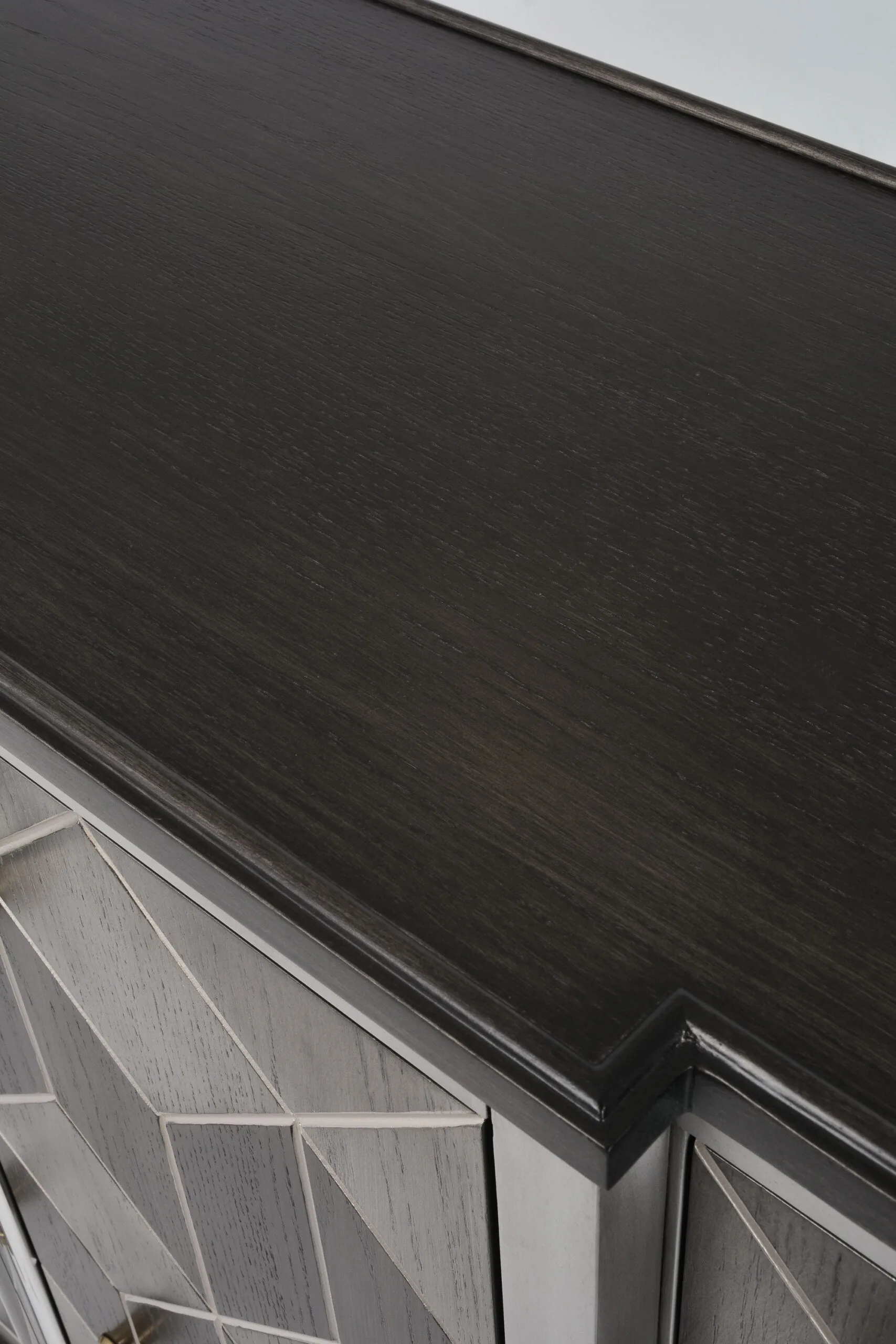 Stilig ST504 kummut elutuppa. See originaalne hall kummut lisab teie elutuppa stiili ja praktilisust. Kummuti esiküljel olev inkrusteering loob 3D-efekti, mida rõhutavad hõbedased jooned. Korpuse pind on kaetud tammespooniga, millel on nähtav puidustruktuur, lisades loomulikkust ja soojust. Akrüülist sirged käepidemed kuldsete metallist aktsentidega annavad elegantse viimistluse.