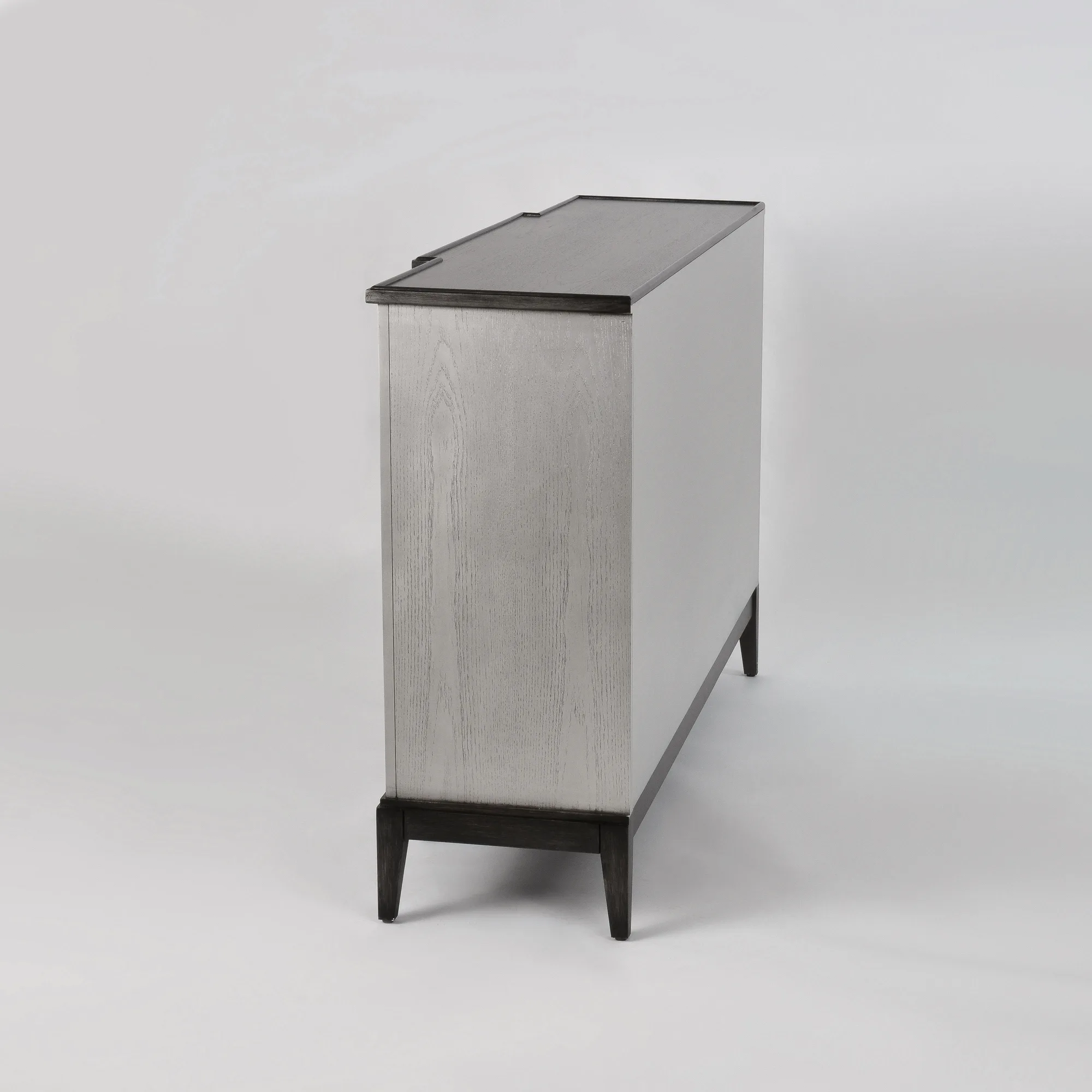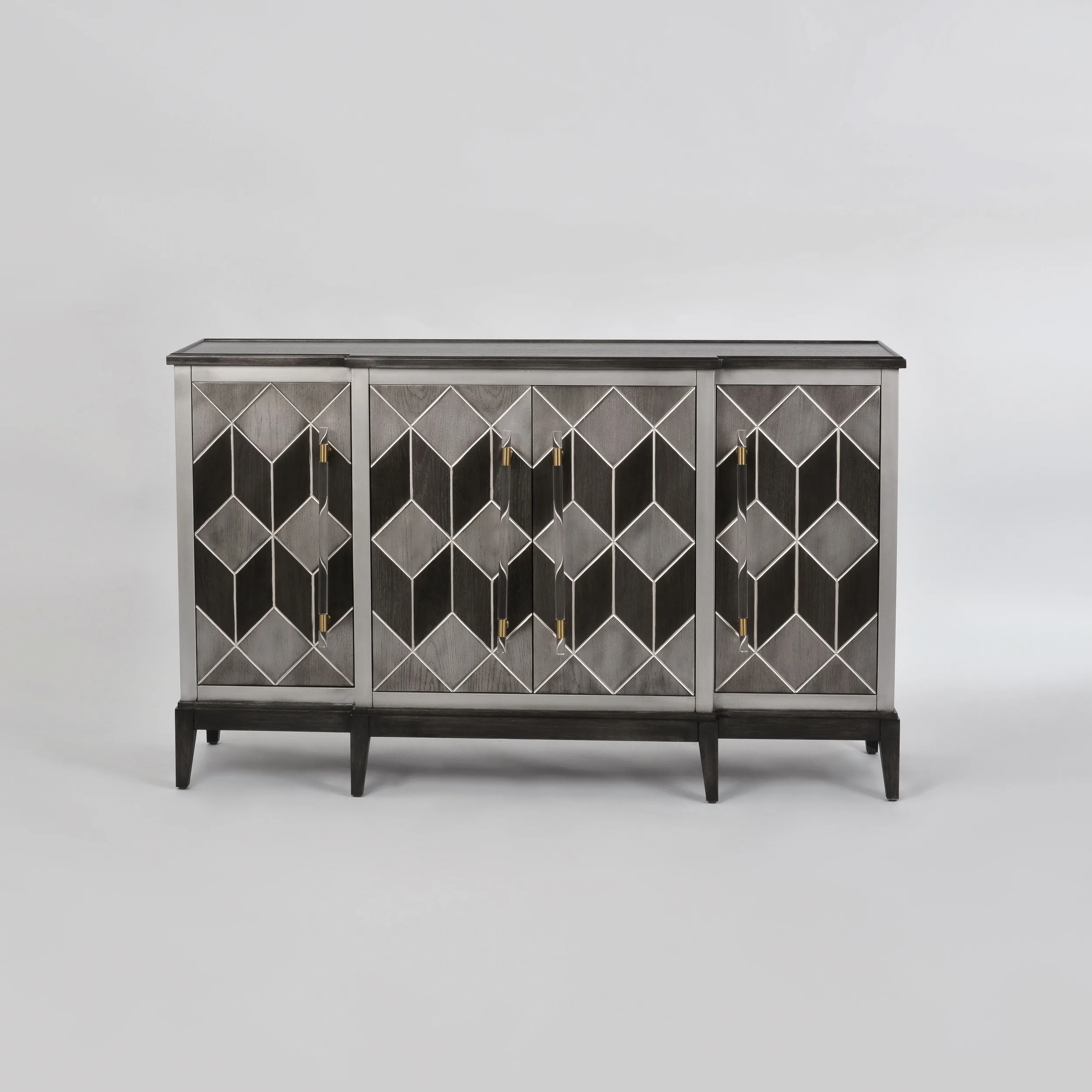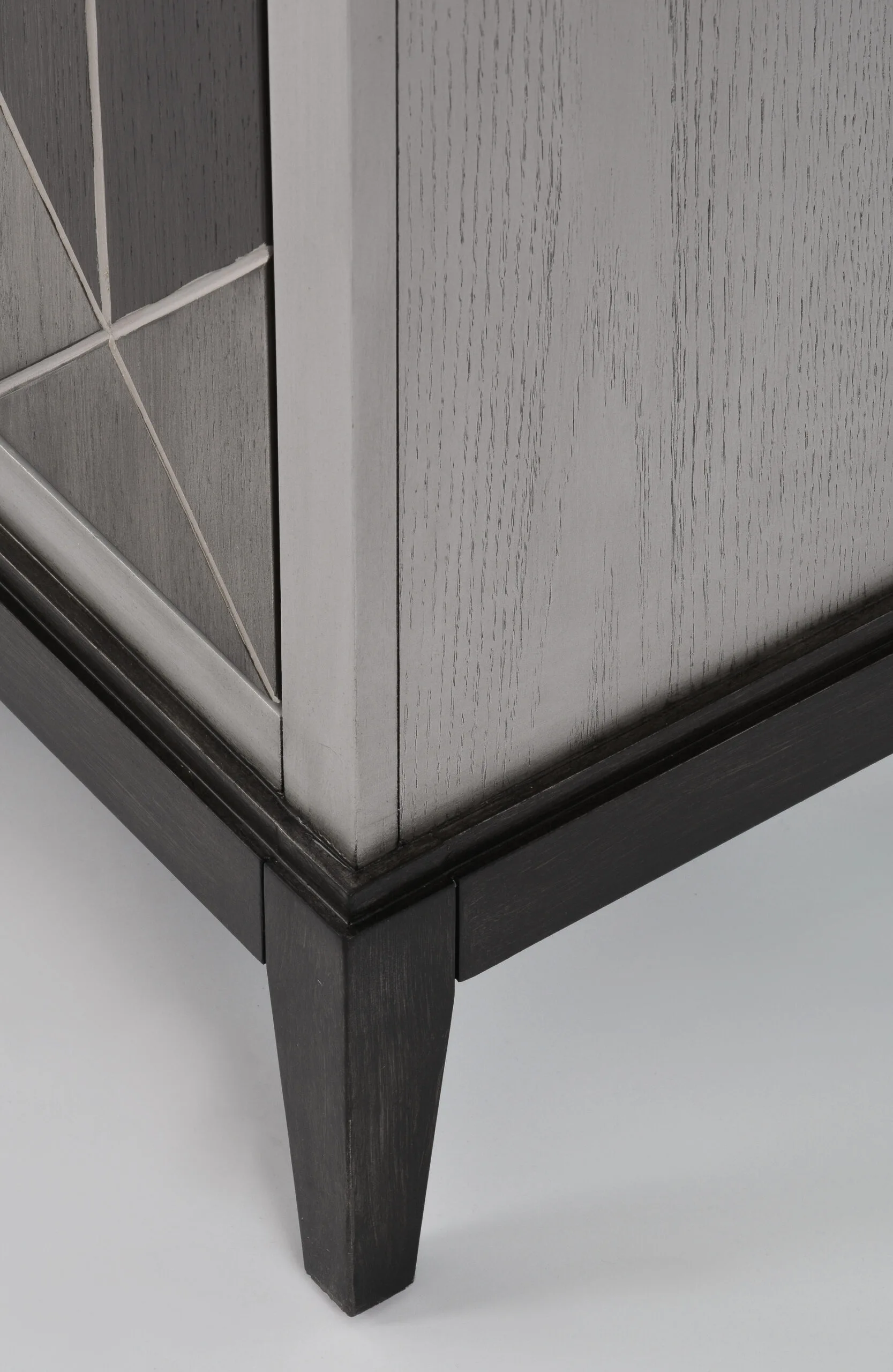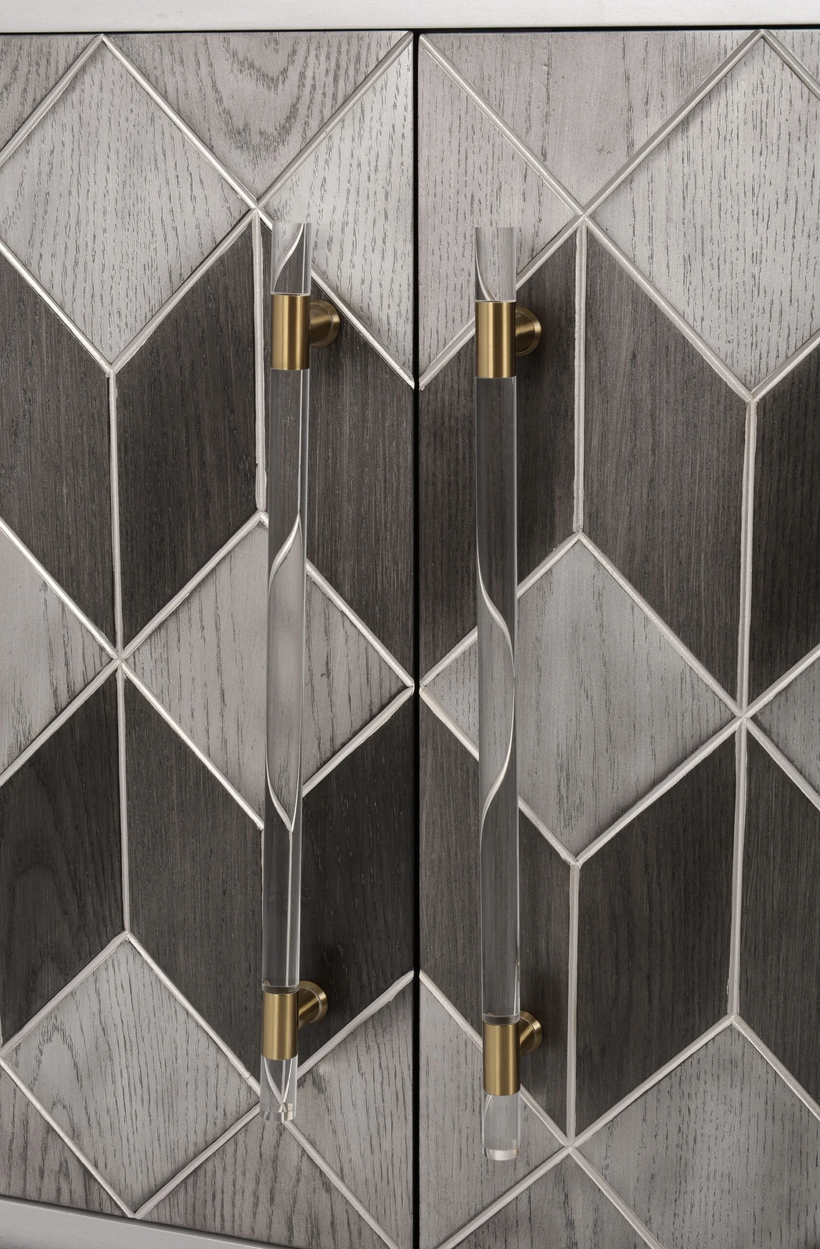 Stilig ST504 kummut elutuppa. See originaalne hall kummut lisab teie elutuppa stiili ja praktilisust. Kummuti esiküljel olev inkrusteering loob 3D-efekti, mida rõhutavad hõbedased jooned. Korpuse pind on kaetud tammespooniga, millel on nähtav puidustruktuur, lisades loomulikkust ja soojust. Akrüülist sirged käepidemed kuldsete metallist aktsentidega annavad elegantse viimistluse.